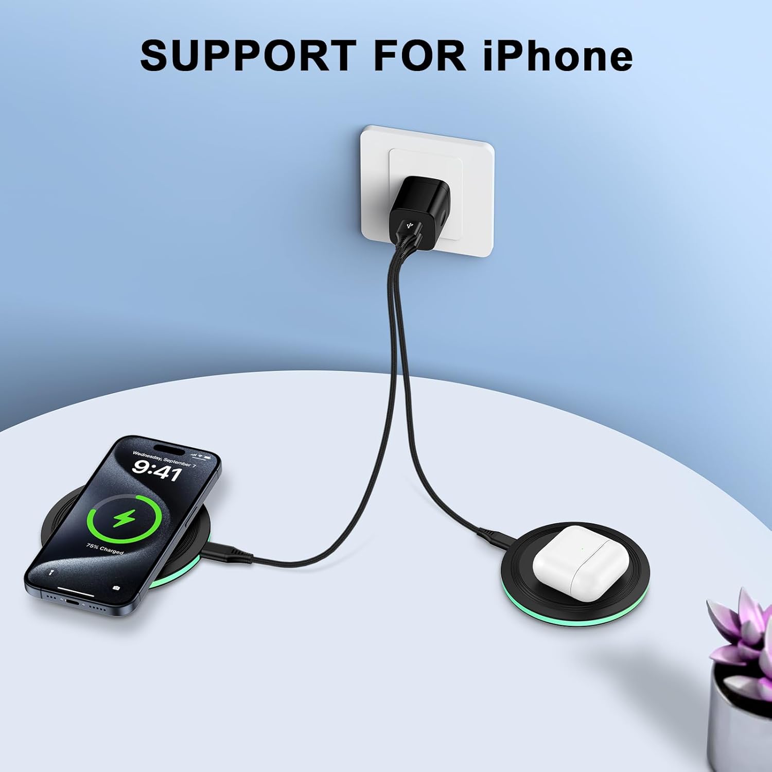 Compared to traditional wired chargers, this wireless charger eliminates the need to look around for a USB charging cable when charging, simply connect the matching USB-A charging cable to the wireless charger pad, which greatly improves the convenience of charging and improves the neatness of the desktop.