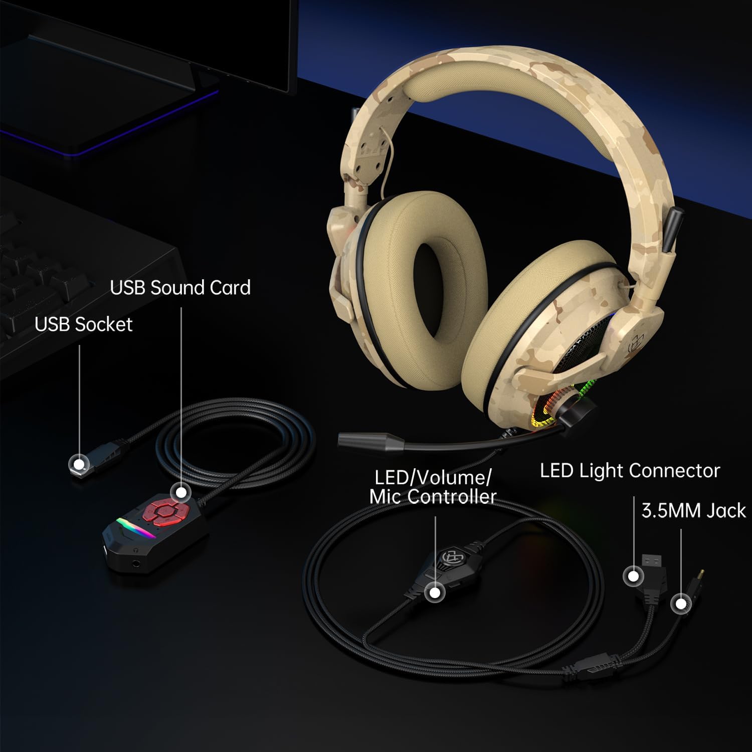 Gaming Headset for PS4 PS5 PC Xbox One Switch, Noise Cancelling Over Ear Headphones with Mic, 7.1 Surround Sound, USB & 3.5mm for Switch Laptop Mobile- Camo Yellow