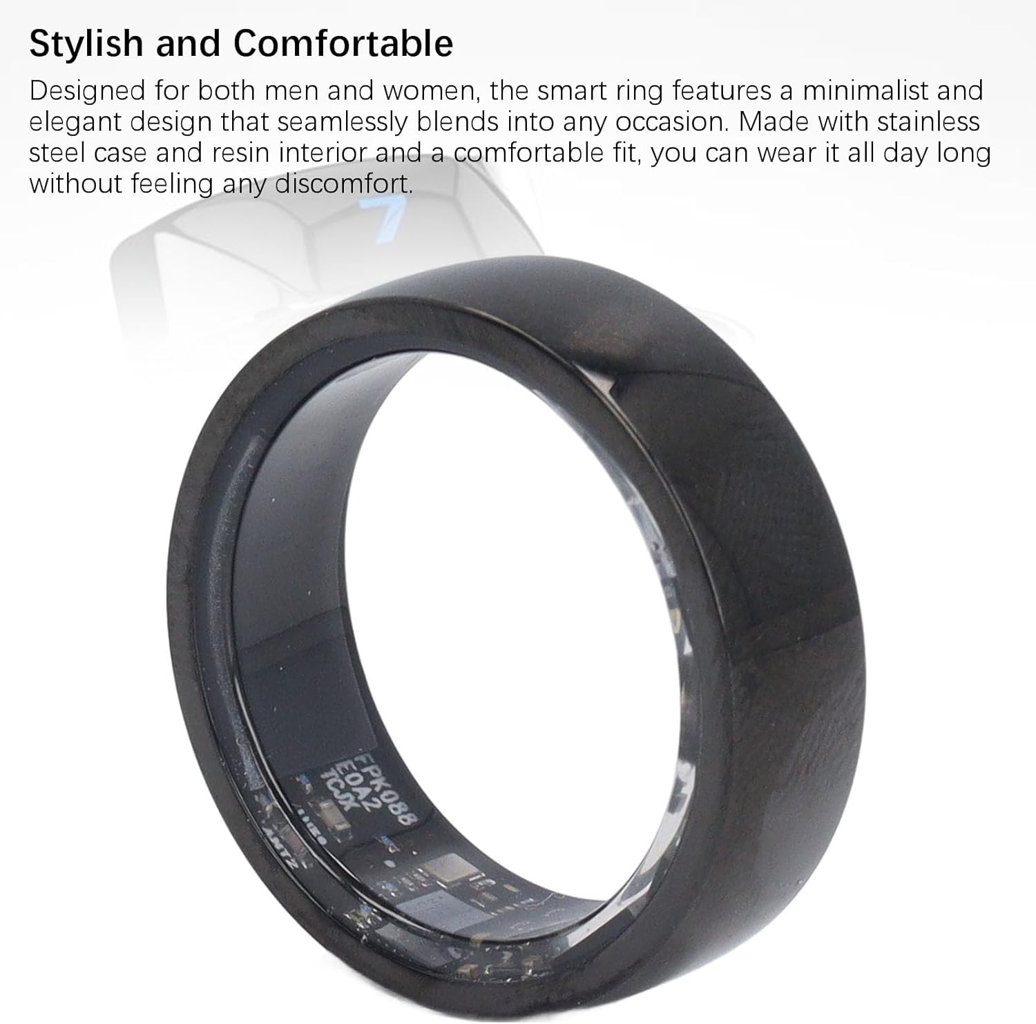 Stylish and Comfortable: Designed for both men and women, the smart ring features a minimalist and elegant design that seamlessly blends into any occasion. Made with stainless steel case and resin interior and a comfortable fit, you can wear it all day long without feeling any discomfort.