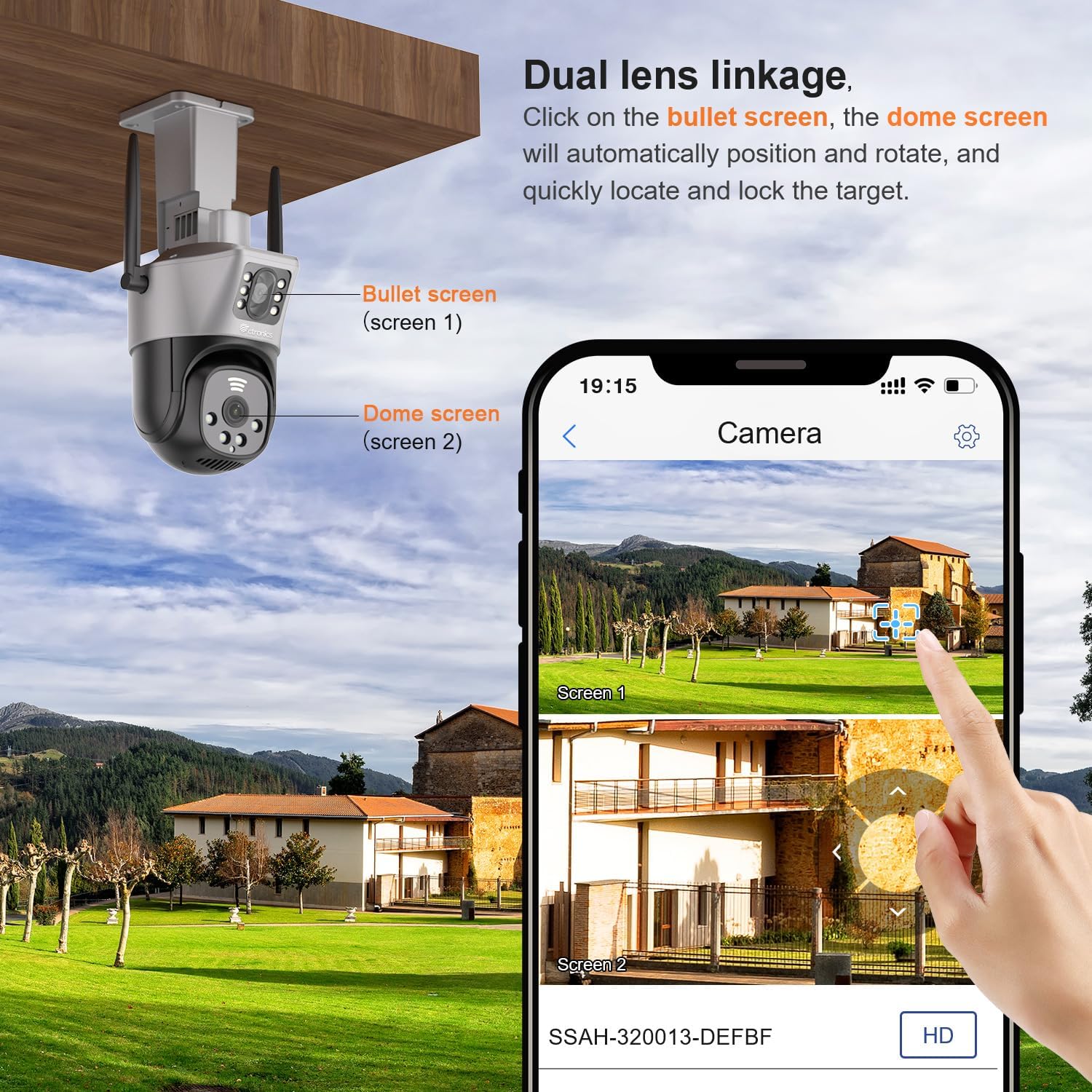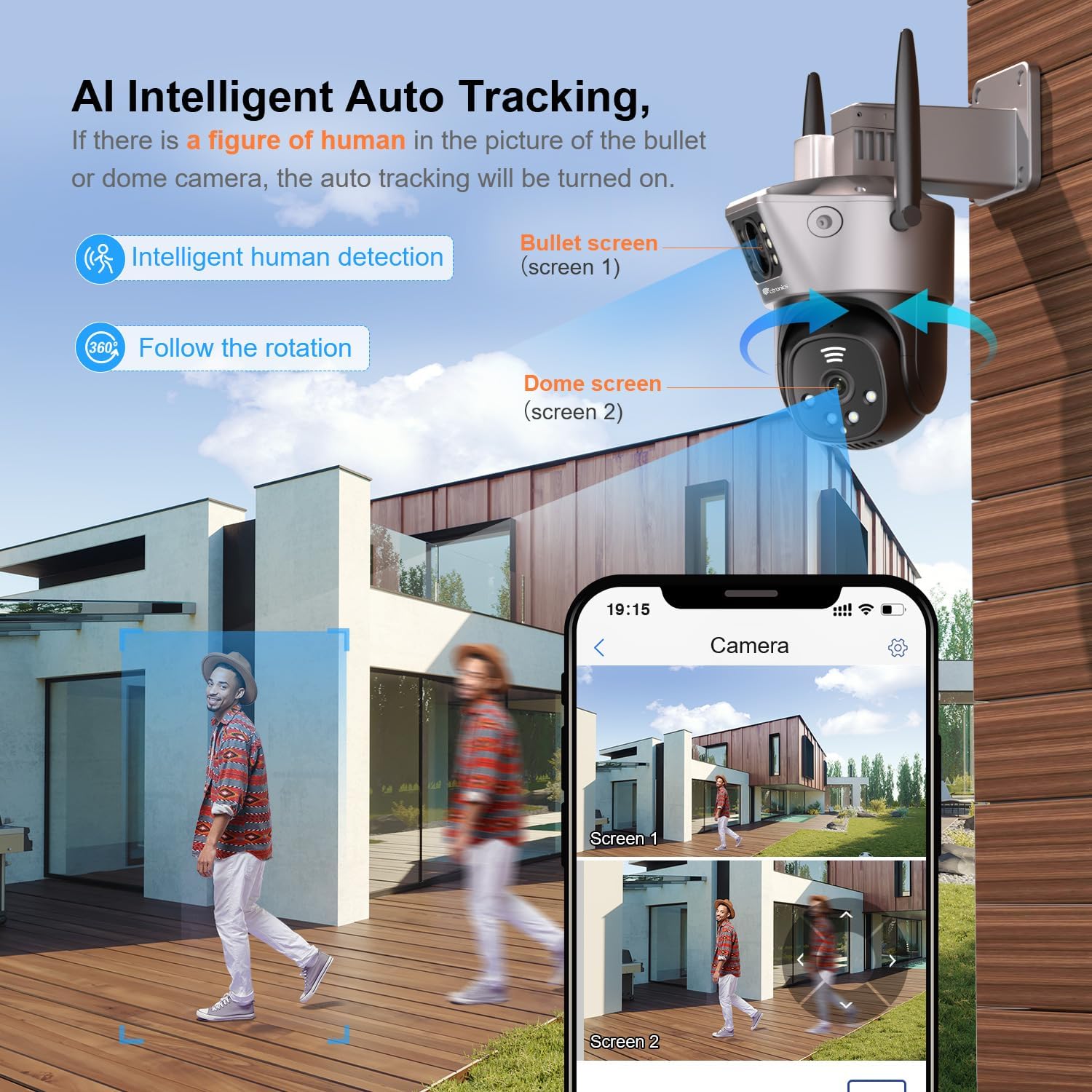 【Dual Lens Linkage】Ctronics Security Camera Outdoor, 2,4/5GHz WiFi Wired PTZ Dual Screen Camera 1080P with Auto Tracking Human Detection 30m Color Night Vision Two-Way Audio IP66