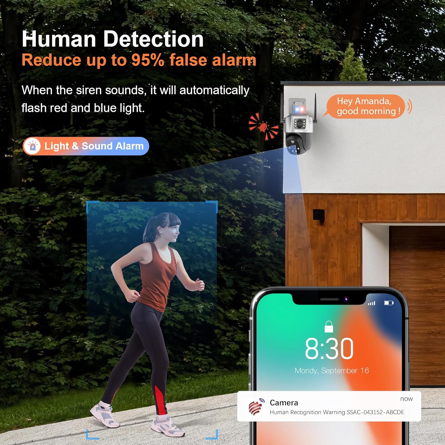 【30m Color Night Vision & Two-way Audio】This ptz outdoor camera won’t let you down with built-in 10 lights and guarantees full color/IR night vision images for up to 30M. Effortlessly capture every detail of your surroundings. There are three night vision modes to choose from. This dual lens security camera has a built-in speaker and microphone so you can talk to visitors in real time or warn of unwanted intruders while you’re out.
