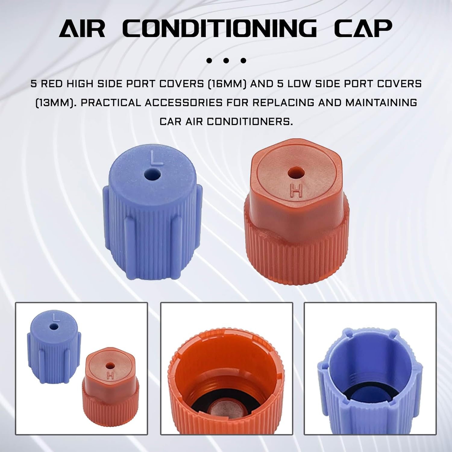 【Specification】R134a dust caps include 5 red caps for high side ports 16mm/0.63in and 5 blue caps for low side ports 13mm/0.51in. (Note: This cap does not have internal threads and only has dust-proof function).