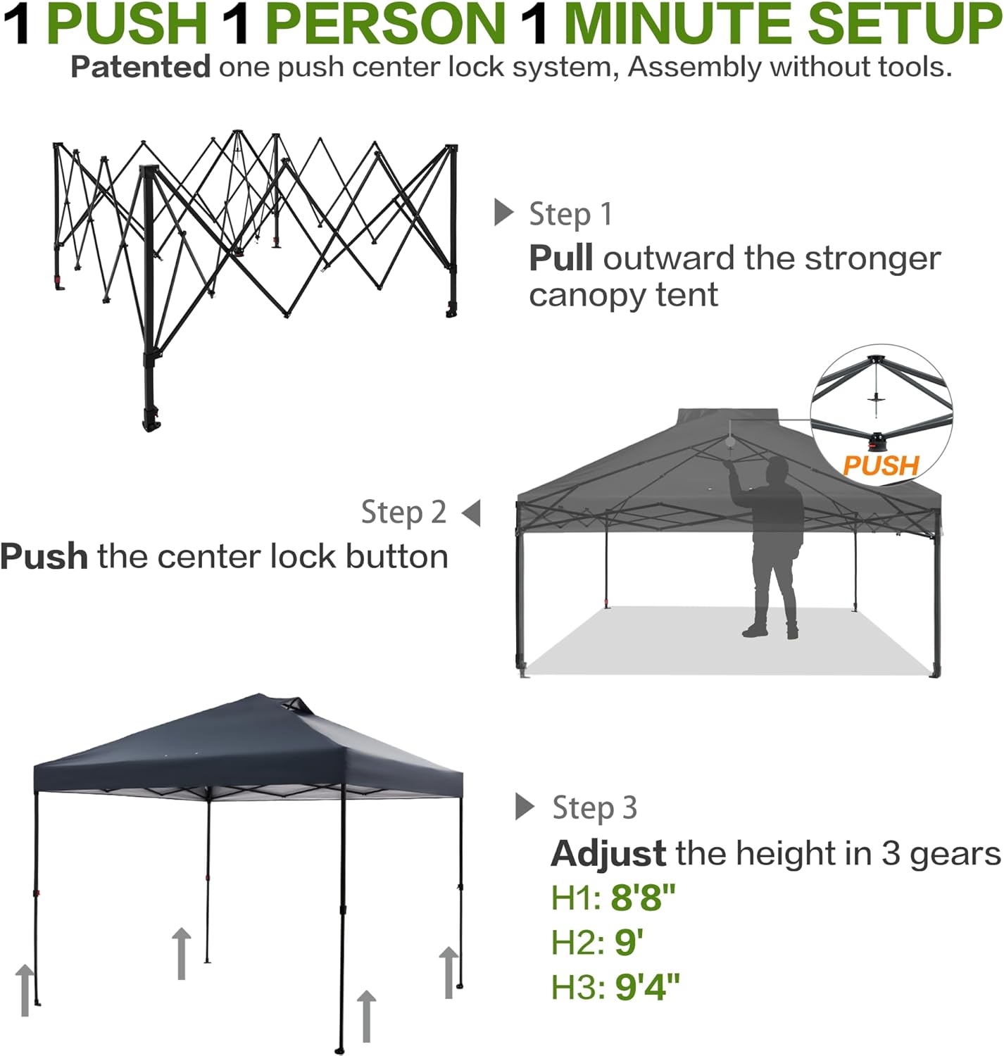 ✅【𝐄𝐀𝐒𝐈𝐄𝐒𝐓 𝐒𝐄𝐓𝐔𝐏 𝐈𝐍 𝐌𝐈𝐍𝐔𝐓𝐄𝐒】The patented central lock system allows one person to set it up in a matter of seconds without any tools.The canopy tent frame is designed by wheels therefore is easy to set up by 3 steps. Firstly, we pull out the canopy frame legs, then we tie the top cover. The final step is to push the lock botton to open the tent.