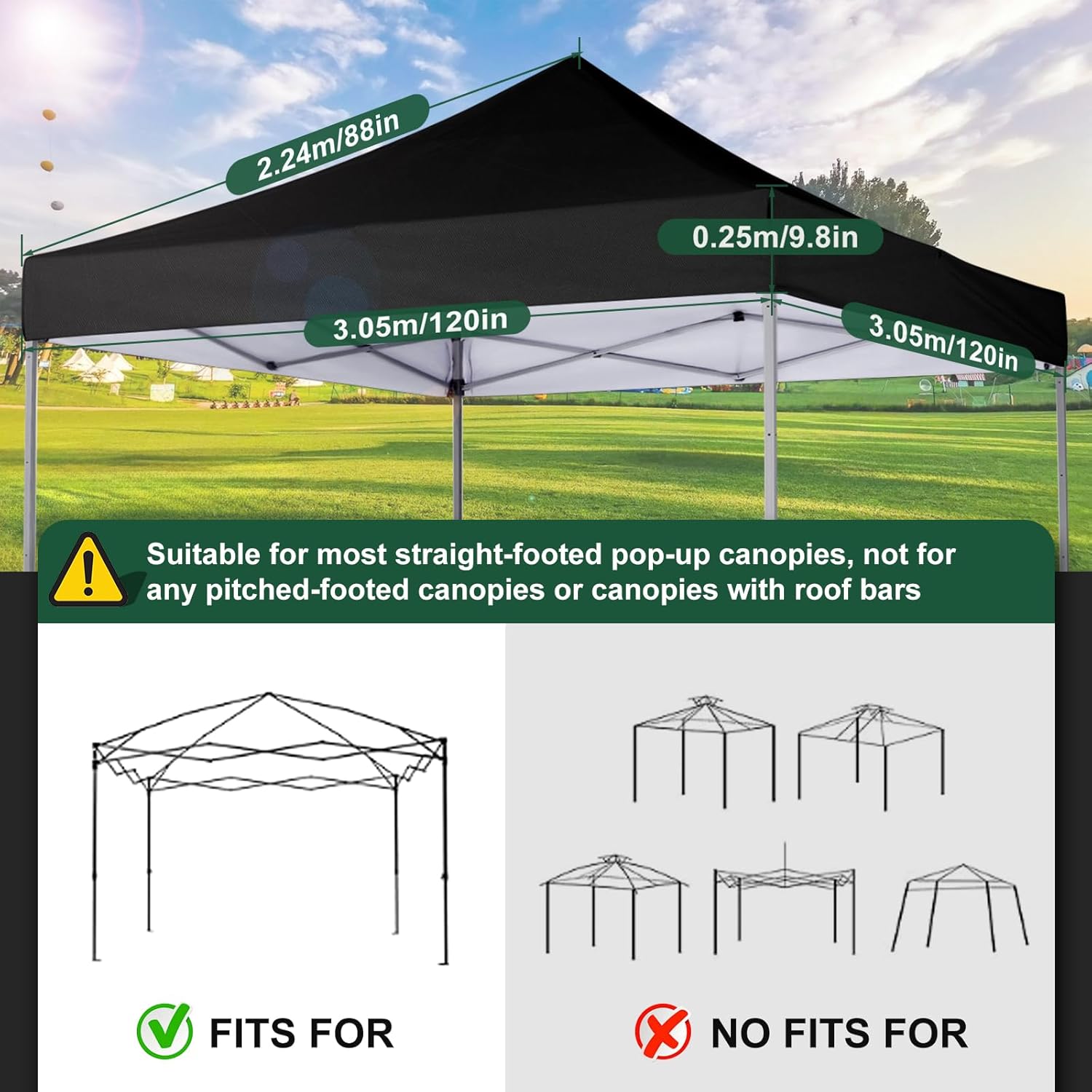 【Upgraded Fabric】Fits most 10×10 without peak pole canopy frames (its really important top check : Not fits have central pole frame). The cover is made of 400 Denier fabric with PU coated provides UPF 50+ UV protection.CPAI-84 rated flame resistant. Latest technology in the industry: Heat sealed seam,prevents water penetrate from seams, 100% waterproof.
