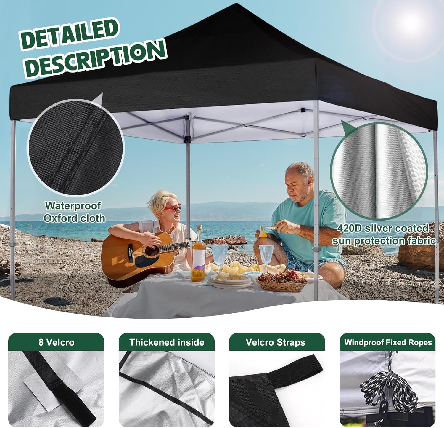 The water resistant fabric provide excellent protection against rain, no need to worry water will seep through itThe reinforced ropes at four corners to keep canopy top stay in place and prevent it from being blown away by the windThe velcro tabs with sticky hair are sewn for easily attached on the canopy frameThe roof is sewn by enhanced process to ensure maximum sturdiness and water resistance