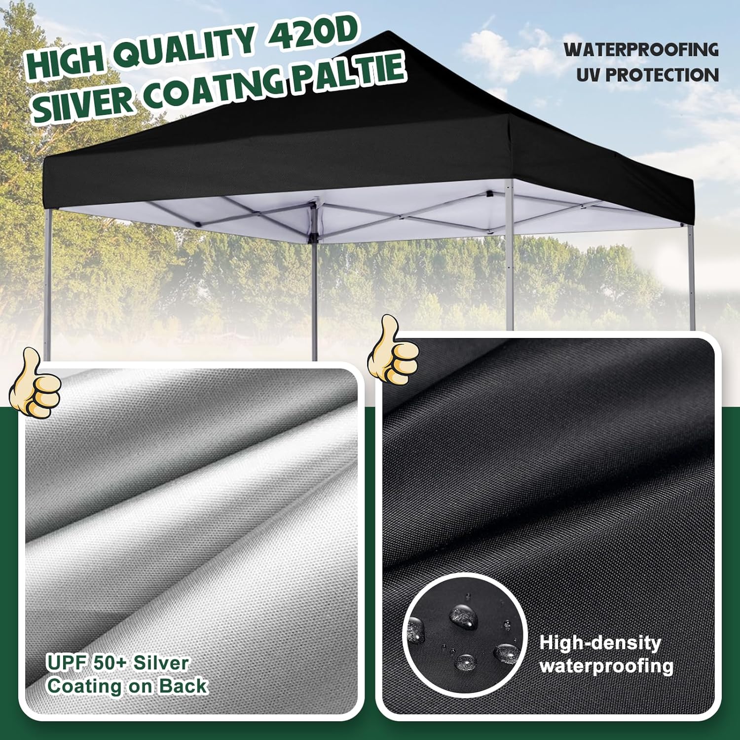 Our durable 10×10/8×8 canopy replacement cover is made of 400D material which can provide waterproof and UV protection. Silver coating on the back provide great sun protection.Durable material that is easy to clean, performs well in preventing rain collection and is not easy to fall off. It can effectively block harmful uv rays,ensuring you stay comfortable and safe under it without being affected by weather changes
