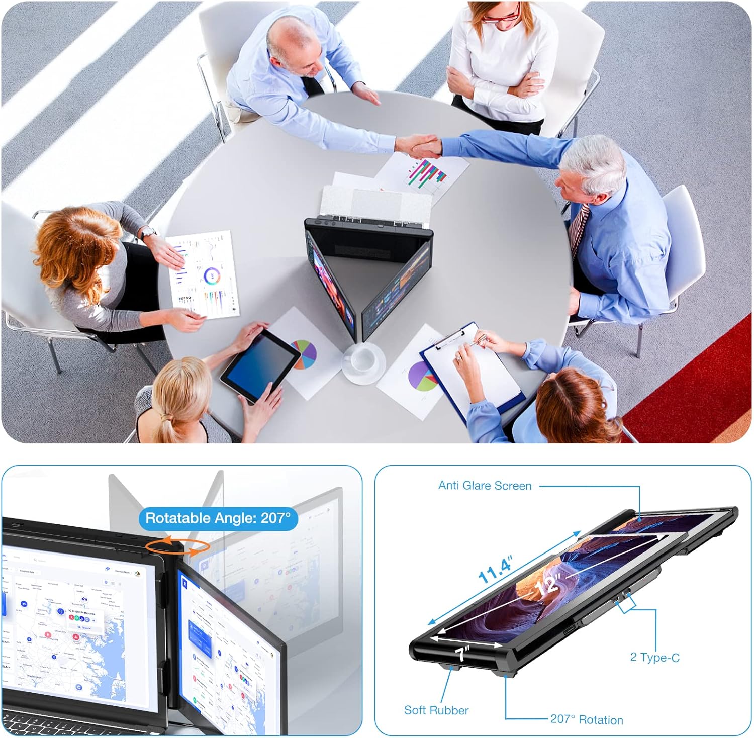 Multi-display Mode: Designed for multi-using scenarios, the full 207°rotation and 180°display mode can achieve multi-person meeting by same-screen sharing, And there are multiple display modes, including landscape, portrait, presentation, kickstand and eye-care modes. Portable triple monitor for laptop has an adjustable scalable bracket to keep stability, avoid screen shaking, instability and tilting when using the display