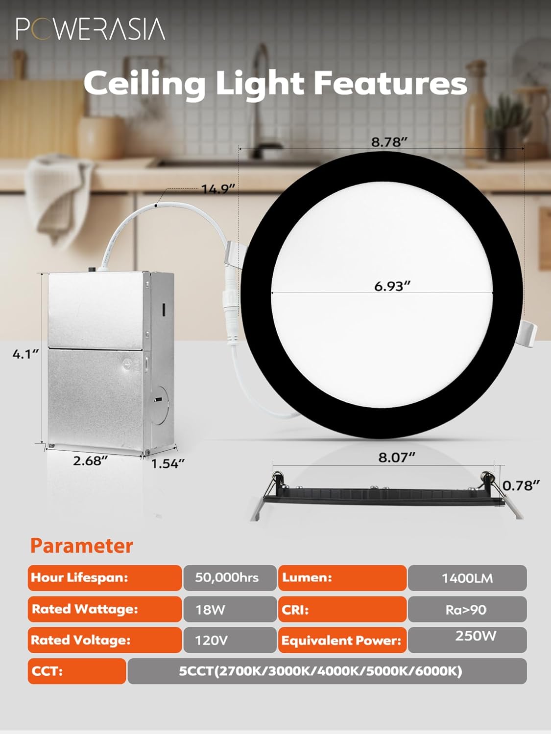 💡【High Brightness】 POWERASIA 90+CRI technology brings true color rendering to your house. The 8-inch slim lights use the new generation of LED chips with higher lumens and lower power. 1400LM 18 Watts, which equals to 250W incandescent lamp, saving you up to 88% in energy costs.