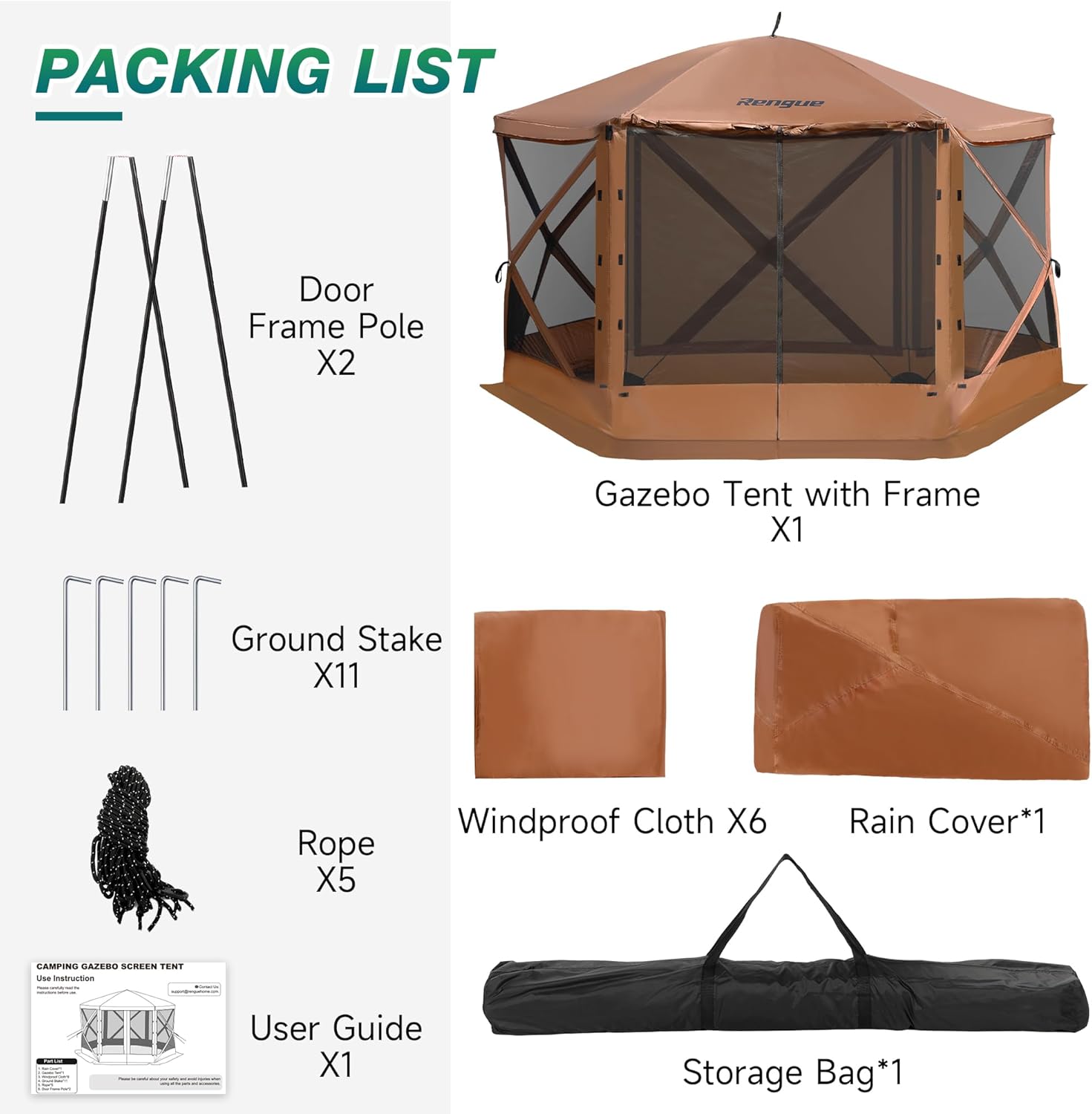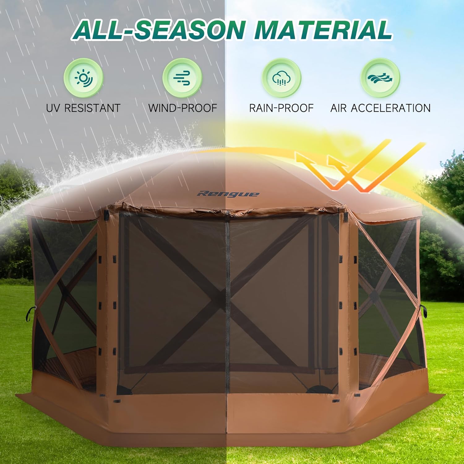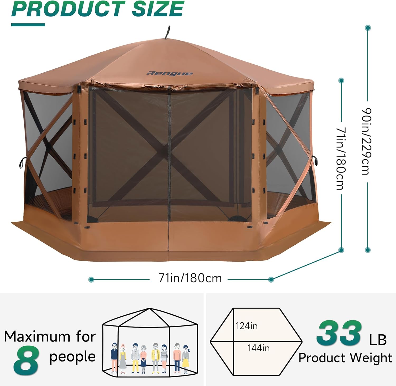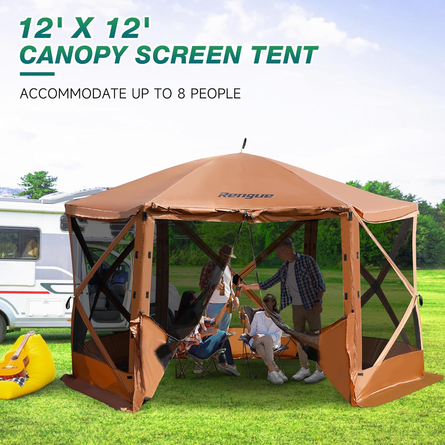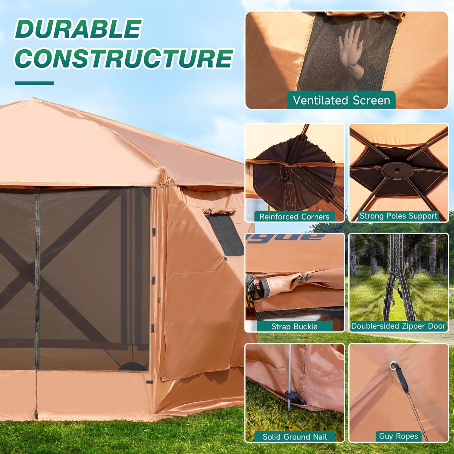 12x12ft Pop-Up Camping Canopy Gazebo, Screen Tent with Mesh Windows & Carry Bag, 6 Sided Shelter Tent with Ground Stakes, Brown