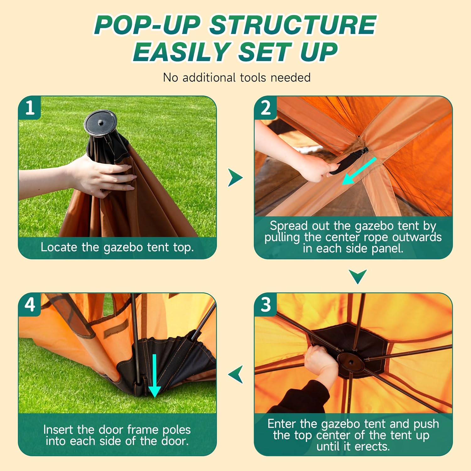 Effortless Assembly – The camping gazebo comes with a pop-up design that greatly simplify the installation steps. No additional tools are required. Perfect for those who value efficiency and convenience during their outdoor adventures. Comes with a carry bag, easy for storage and carry.