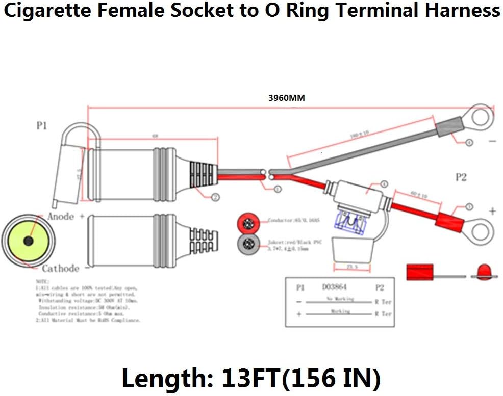 Cable: SPT-2 16AWG/2C; Length: 13FT(156”). With Fuse case: 15A for safety. 12V solid socket has a nice rubber cap which keeps out dirt and water.