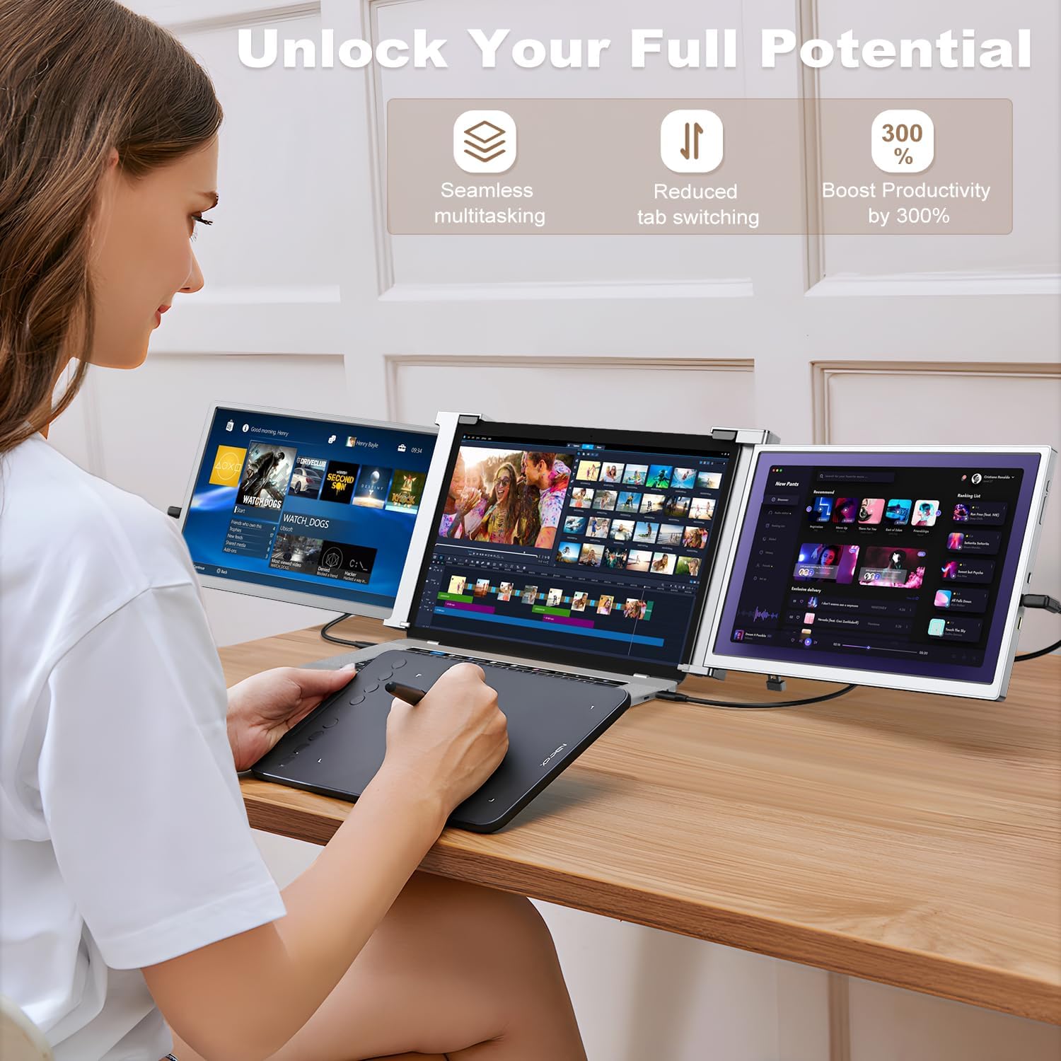 The DORPU 14″ IPS triple monitor for laptop seamlessly transforms your laptop into a dynamic multi-screen workstation and unleashes unparalleled productivity. Easily transition from a single to a triple screen portable monitor and enter a new era of seamless multitasking.