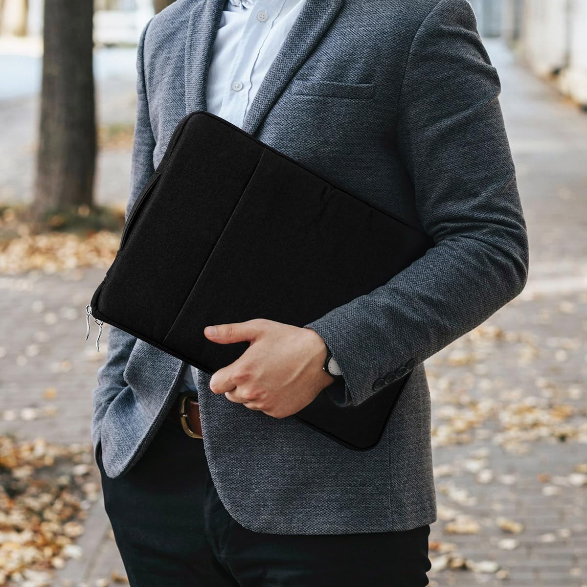 Made with waterproof polyester fabric exterior and shock-resistant fluffy inner, the laptop carrying pouch can protect your laptop from accident bumps and shocks.