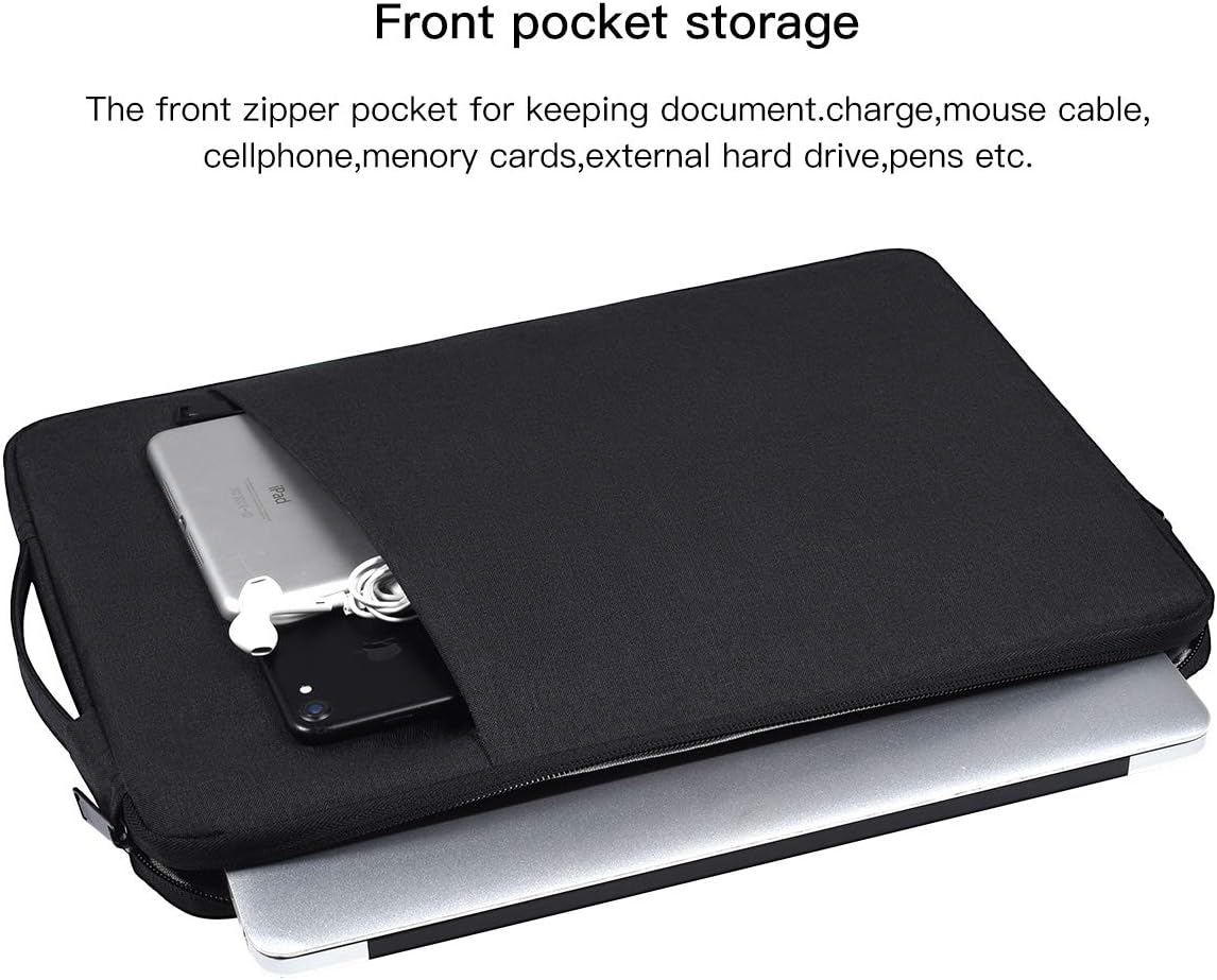 FRONT ONE POCKET STORAGE & DURABLE ZIPPER – One pocket in front, enough space to keeping, mouse, cable, cellphone, memory cards, external hard drive, pens etc. Top-loading zipper on the sleeve glides smoothly and allows convenient access to your laptop