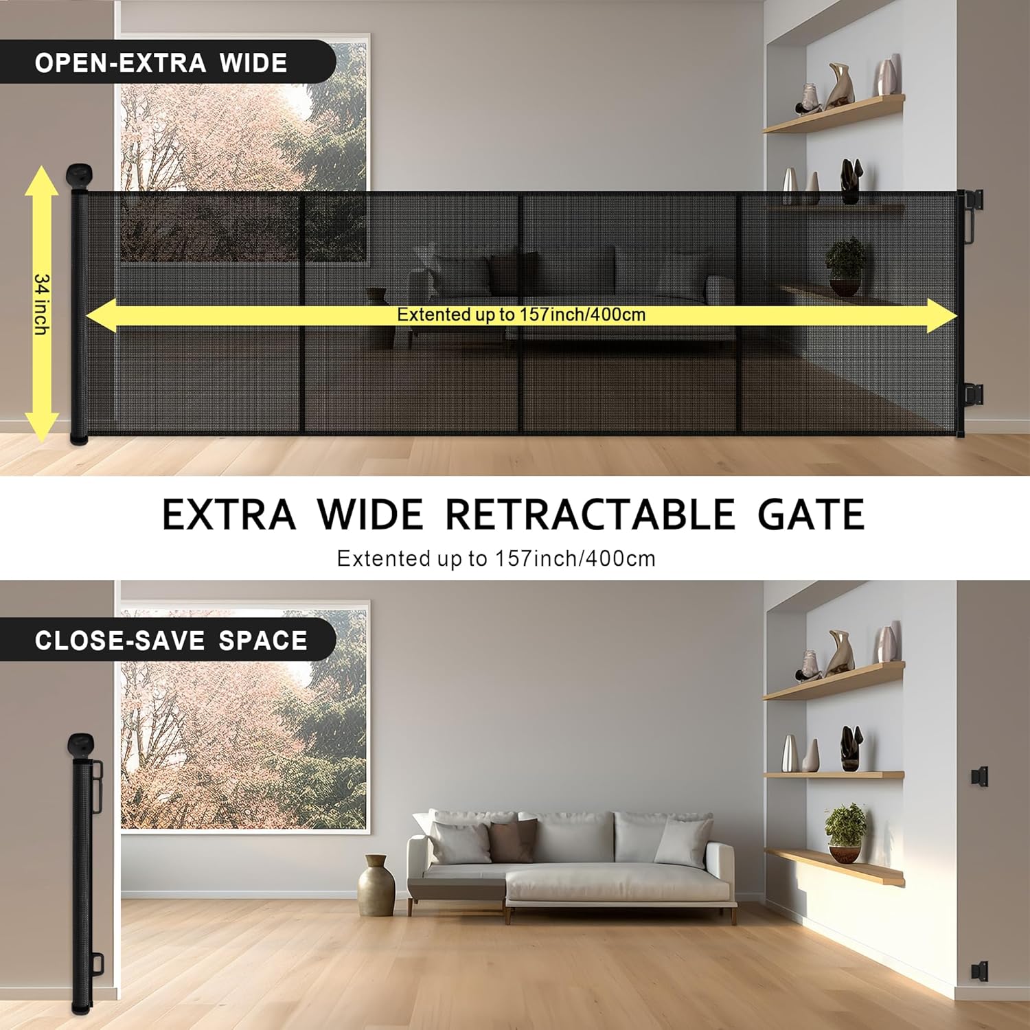157 Inch Extra Large Retractable Baby Gates for Large Opening, Extra Wide Retractable Dog Gate for Indoor Outdoor Stair, Mesh Kids Safety Gate or Pet Dog with Long Size for House Doorways Hallways