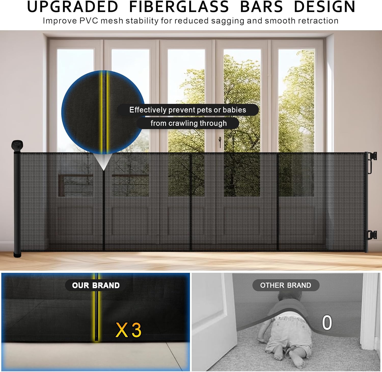 💕【Durable and Safe Mesh Gate】- Crafted from sturdy PVC mesh, our extra-wide baby gate provides superior safety, reducing the risk of accidental injuries during playtime. Its robust construction offers excellent scratch resistance, ensuring durability against pets and outdoor use. Easy to clean and long-lasting makes the retractable dog gate ideal choice for busy families seeking convenience and peace of mind.