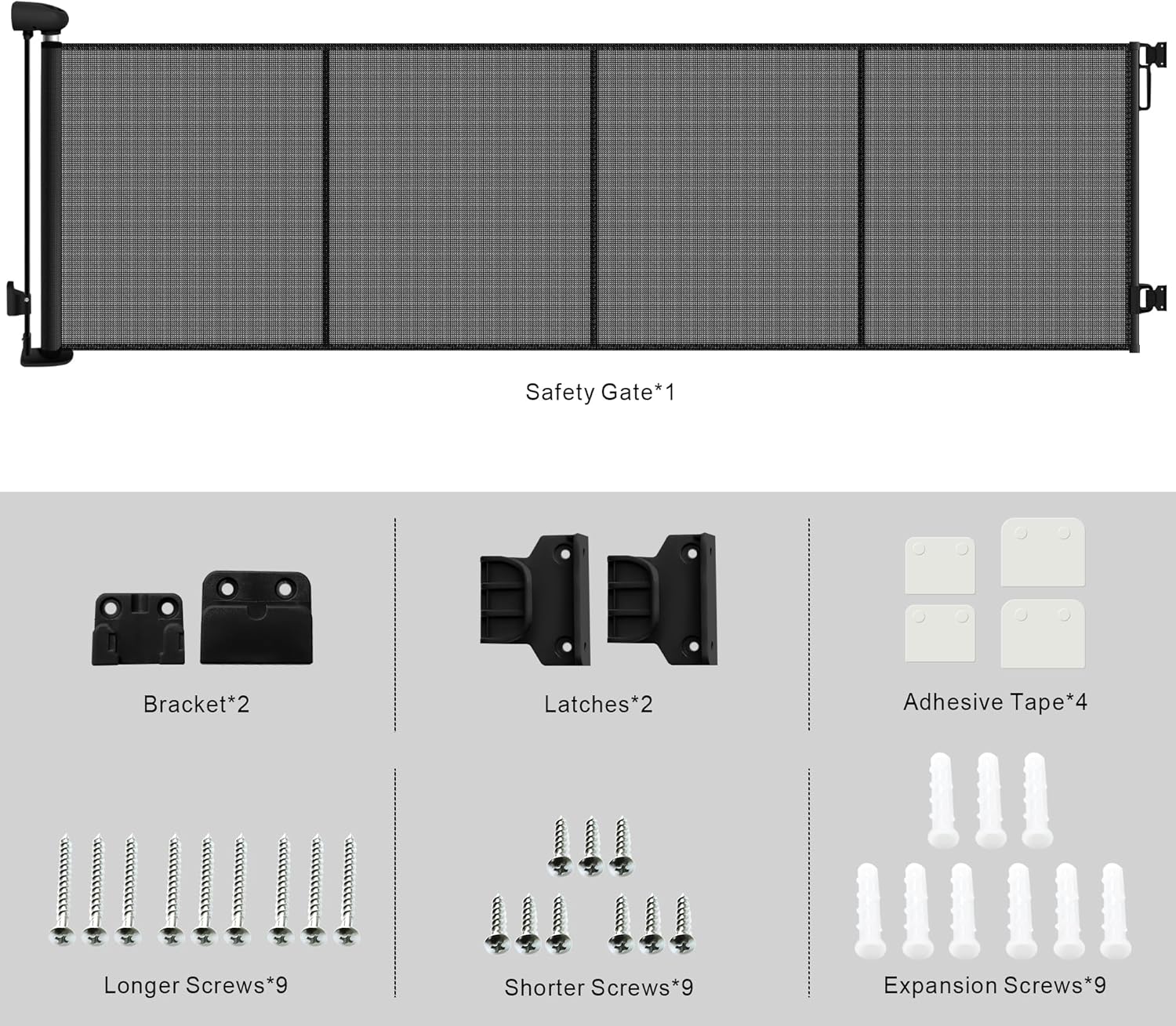💕【Effortless Installation】- Includes all necessary components for quick and easy setup indoors or outdoors. Our package contains a Retractable mesh safety gate, Brackets, Latches, Wall anchors, Longer and Shorter Screws, Adhesive Tape, and Instructions for hassle-free installation. Need assistance? Our customer support team is ready to help.