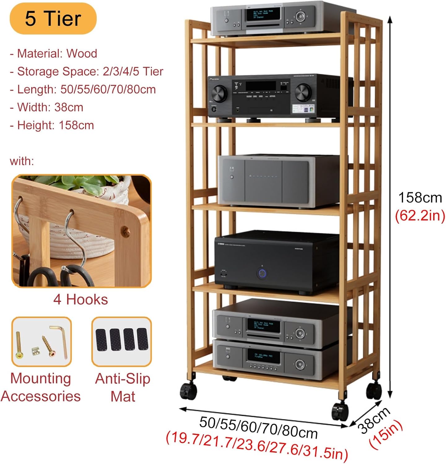 2 3 4 5 Tier Brown Wood Audio Rack, Floor Rolling AV Media Holder for DVD Players, Game Console, TV Box, WiFi Router, Turntable Stand with Adjustable Shelf(Color:158cm/62.2in(H),Size:55cm/21.7in(L))