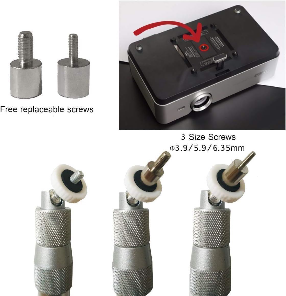 UNIVERSAL MOUNTING-Universal Mini Projector Mount is for almost all projectors with 3 sizes of screw diameters, 0.153/0.232/0.25in (3.9/5.9/6.35mm). Premium Quality Thickened Aluminium Alloy.