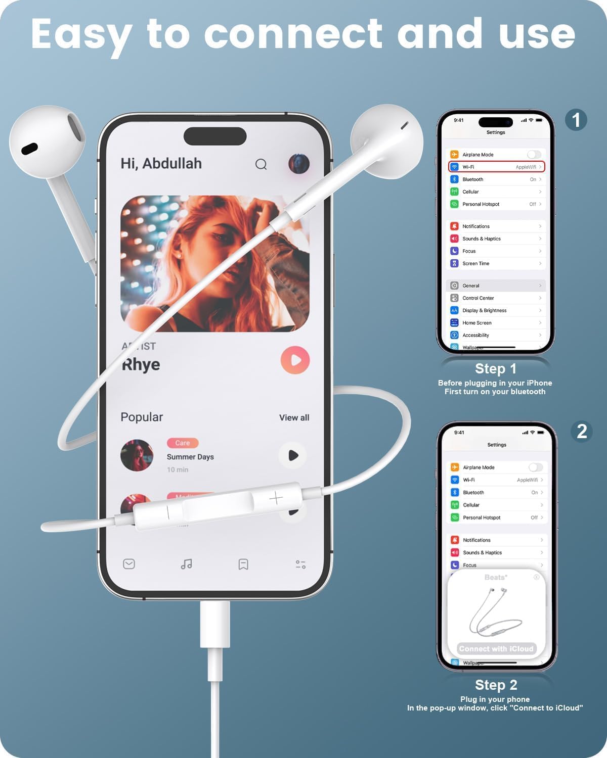 【Easy to use】: You need to first open Blue t00th on your phone, then insert the headset into the iPhone, a pop-up window will appear in 2-8 seconds,You need to click “Connect with iCloud”. (When next time you use the earphone again, it will automatically connect to your device.)