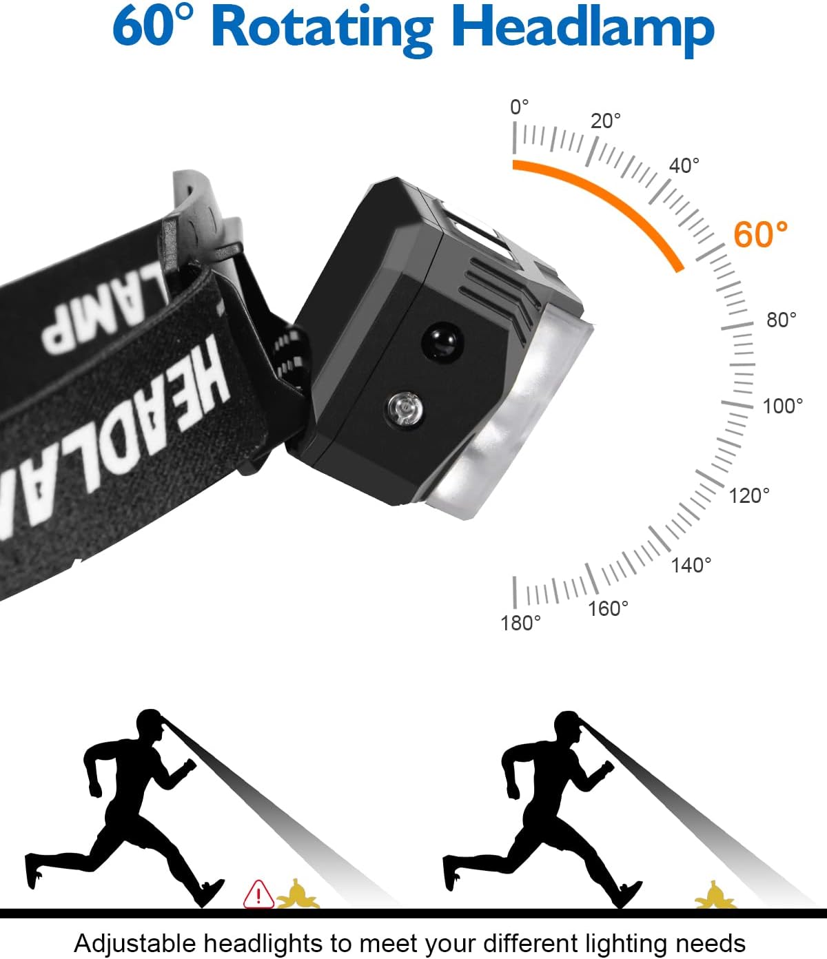 10 Modes and Motion Sensor: The head flashlight has 10 modes to meet all your needs.①Power Button-6 key modes, you can switch the main strong beam, main weak beam, side strong beam, all lights bright, red beam, red strobe.②Motion Sensor Button-4 motion sensor modes, you can easily turn the lights ON/OFF by waving your hand.