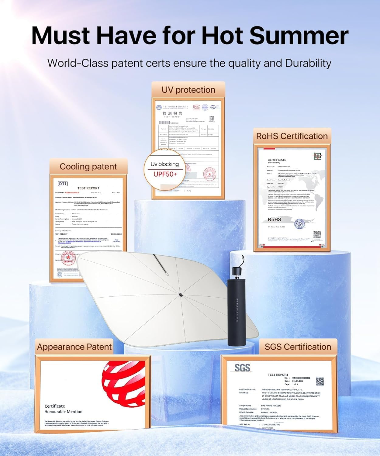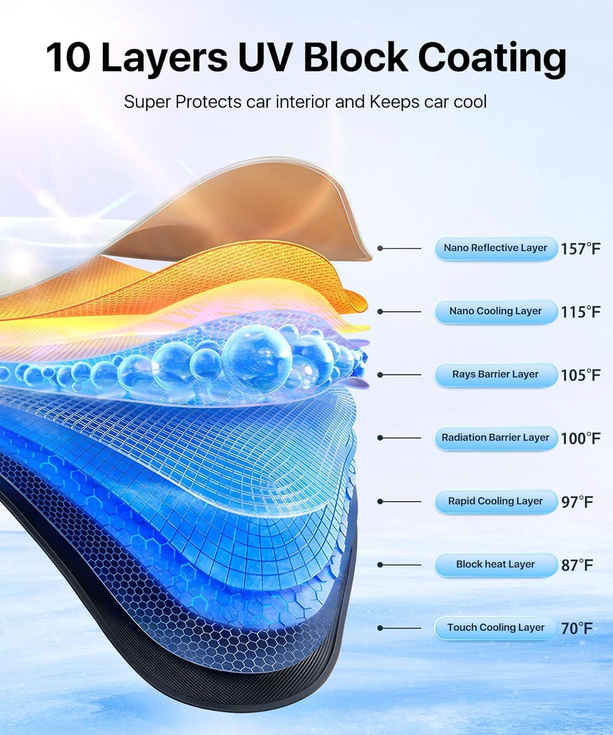[Expert Windshield Sun Shade for Car] Our Master Sun Shade car windshield with Super Heat Insulation Protection Function is designed to keep the car cool for every driver’s experience. With innovative military-grade design and Unique ice crystal nanomaterials, they can ensure 100% reflection of all sunlight and sun rays. Create a comfortable ambiance and cool, refreshing driving atmosphere that suits your car best.