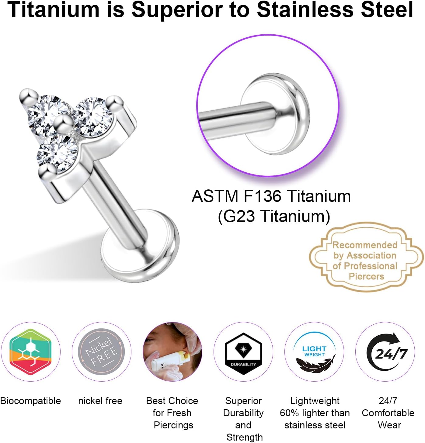 While some may argue that stainless steel is also hypoallergenic and tarnish-free, we go the extra mile by using premium ASTM F136 titanium. Because your safety and comfort are our top priorities.
