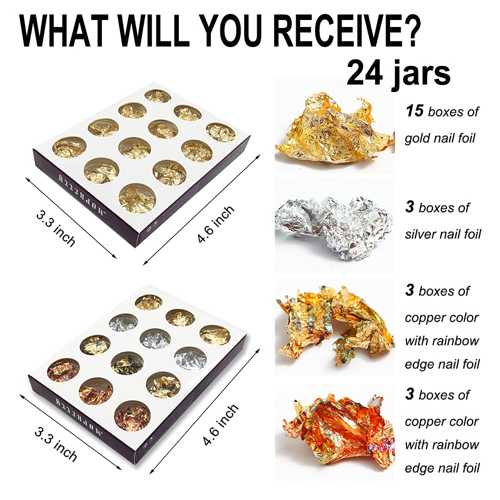 ✨ WHAT WILL I RECEIVE– This set contains 24 jars of 8 colorful nail foils( gold, silver, rose gold and 4 charming colors). The gold nail foil flakes will be packged in 2 boxes.