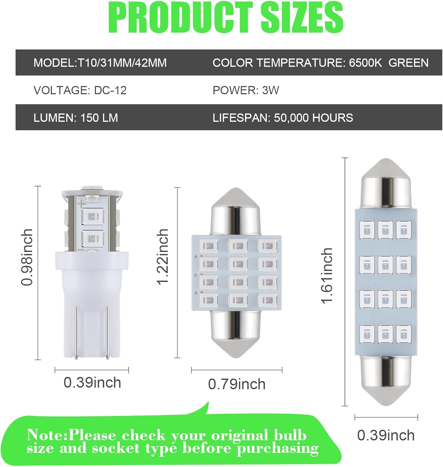 Fit: Our interior LED lights for Car are compatible with T10 194 147 152 158 159 161 168 175 184 192 193 2825 2827 W5W etc, 31mm suitable for sockets in the models of DE3175, 3021, 3022, 3175, 6428, 6430, 7065, DE3021, DE3022, DE3023 etc, 42mm suitable for 211-2, 212-2, 214-2, 2112, 2122, 2142, 578, 576, 560, 569 etc. Please check the size of your socket carefully before ordering.