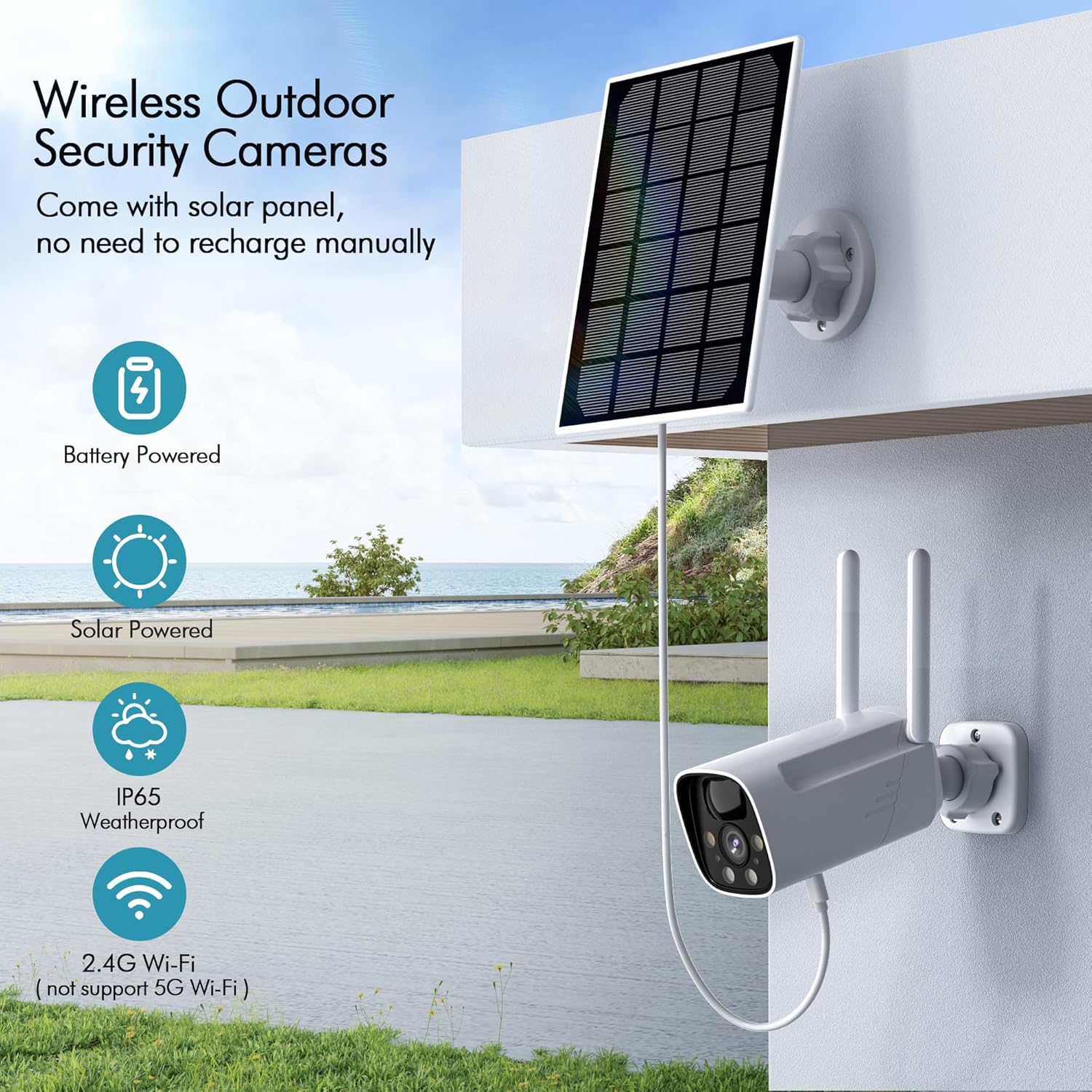 [100% Wireless & Solar Power Supply] Security camera supports 2.4GHz WiFi connection.These wireless outdoor cameras harness the power of solar energy to operate efficiently, eliminating the need for conventional power sources and ensuring uninterrupted monitoring in any remote location. Outdoor camera wireless feature robust, weather-resistant designs, ensuring reliable performance in rain, snow, or intense sunlight.