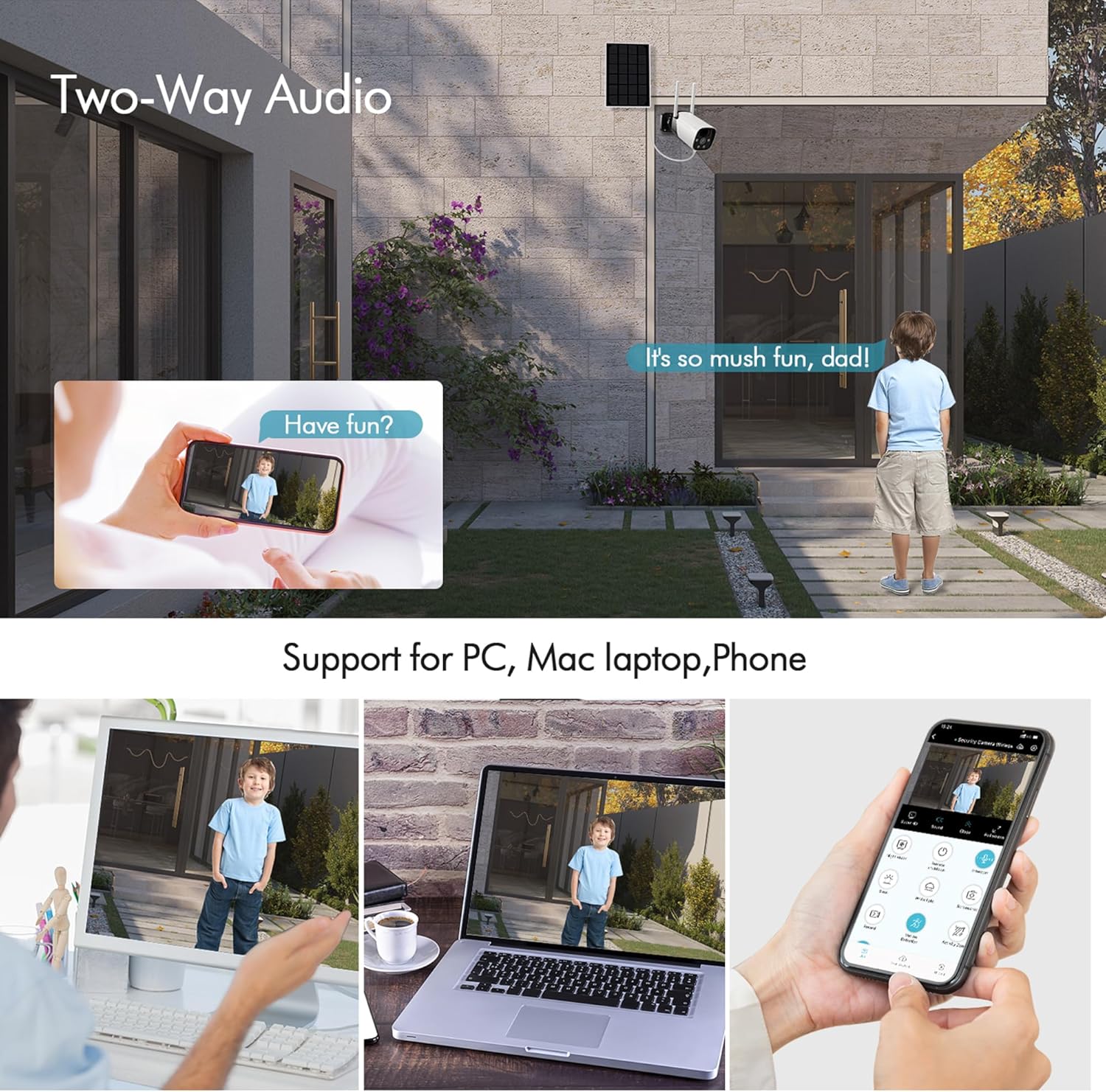 [Two-Way Audio & Multi-User Sharing] Solar security camera wireless outdoor with built-in microphone and speaker. The two-way audio functionality allows you to listen and speak through the camera, enabling interactive monitoring and communication with individuals on your property. Security camera support multi-user sharing, allow designated users to view camera images in real-time.
