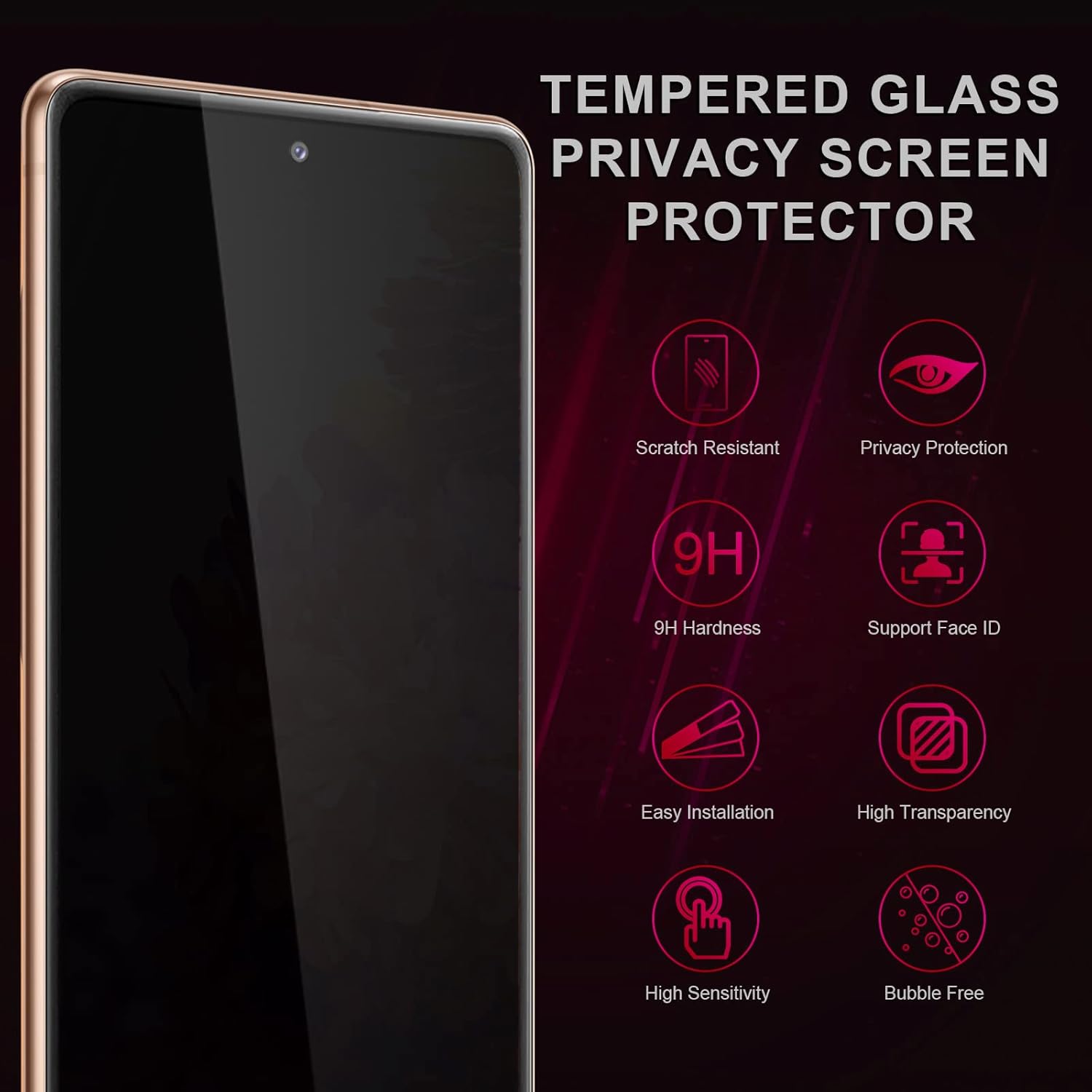 True 30° anti-spy protection, ultra-clear frontNot affect Face ID9H hardness, Shatterproof, Shockproof, Anti-scratches, HD(99.99% transparency)High sensitivity and comfortable touch feelingSuper easy installation, bubble-free, etc