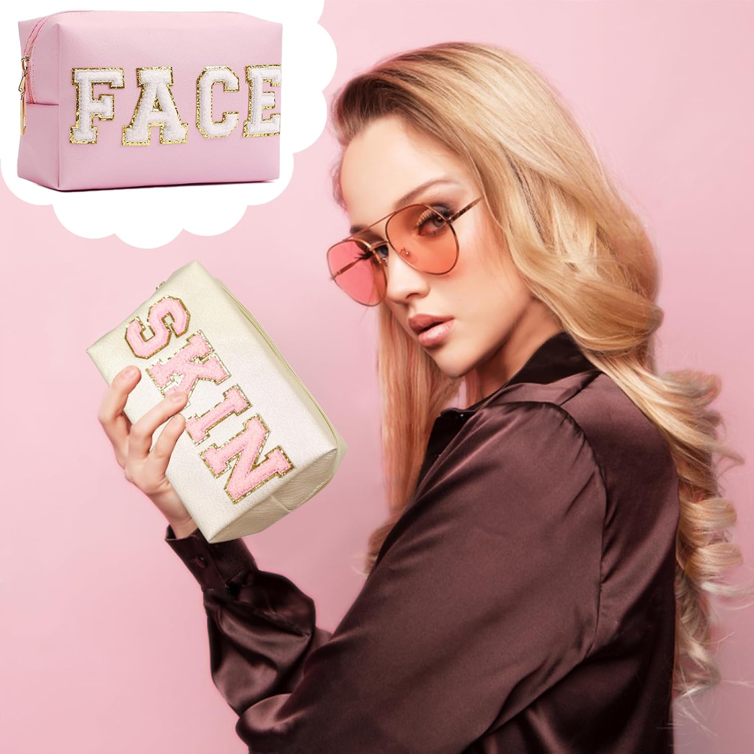 3 Pieces Preppy Patch Makeup Bag, Small Chenille Letter Cosmetic Bag, PU Leather Waterproof Zipper Skin Care Toiletry Bags for Teen Girls, Portable Preppy Gift for Women(White, Blue, Pink)