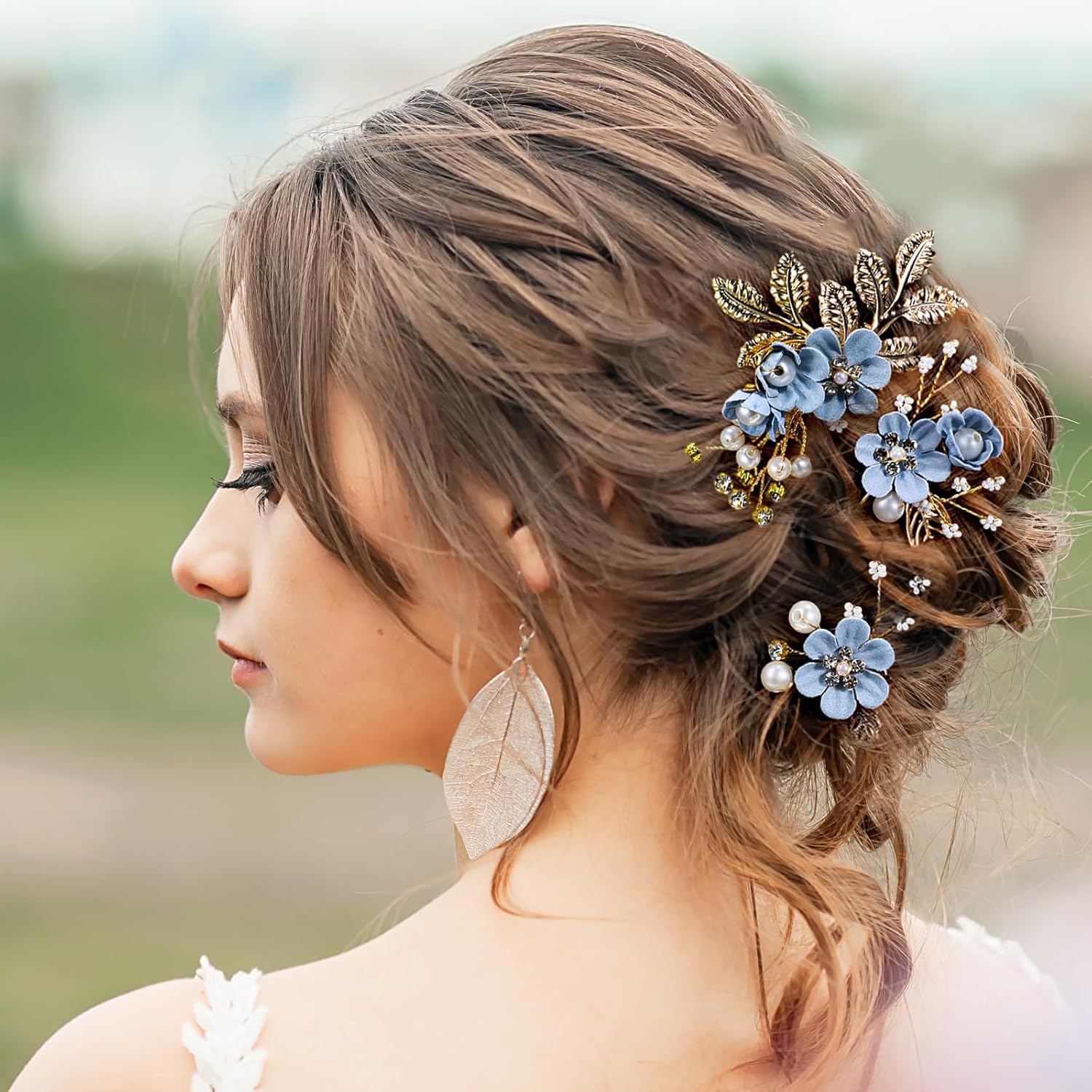 3 Pieces Wedding Flower Hair Pins Blue Floral Hair Accessories Pearl Bridal Hair Comb Slides U-shaped Headpiece Twist Spiral Hair Clips for Brides Bridesmaids Women Girl Party Prom