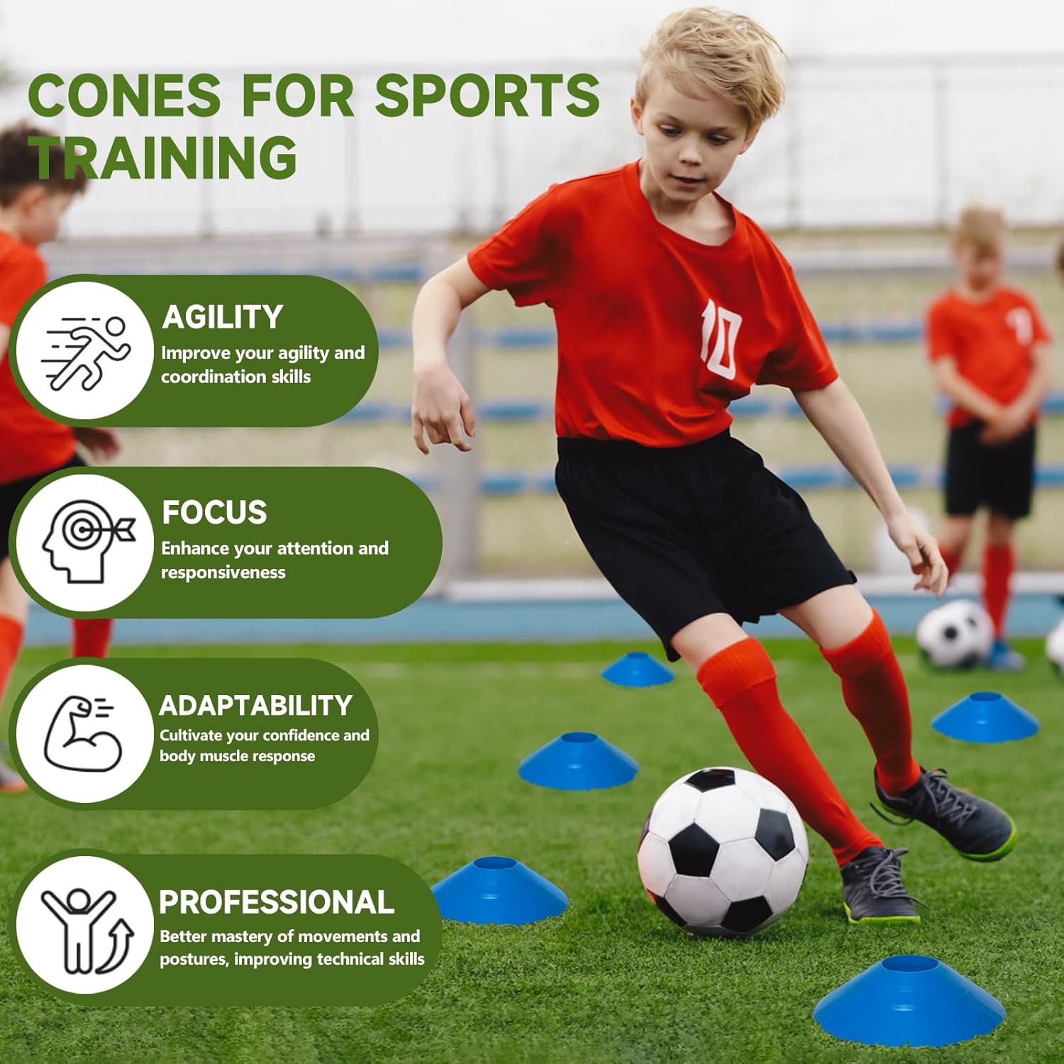 [Multi-purpose Training Tool]: The marker cones is a multifunctional training device for various sports such as football, rugby, basketball, and agility training, which can help improve training by improving performance, speed, and footwork.