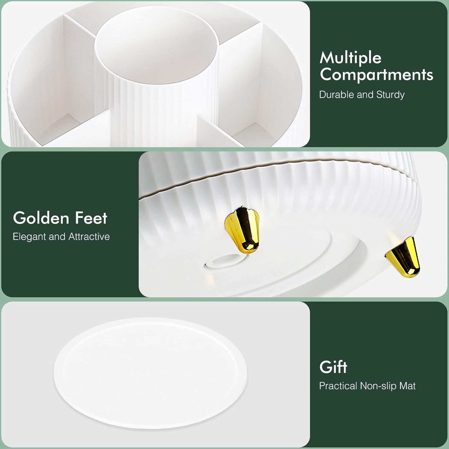 【Anti-Slip Mat】Our round display case comes with an anti-slip mat that keeps your items securely in place, preventing them from sliding or tipping over. No more worrying about your precious perfumes or skincare products falling and breaking.