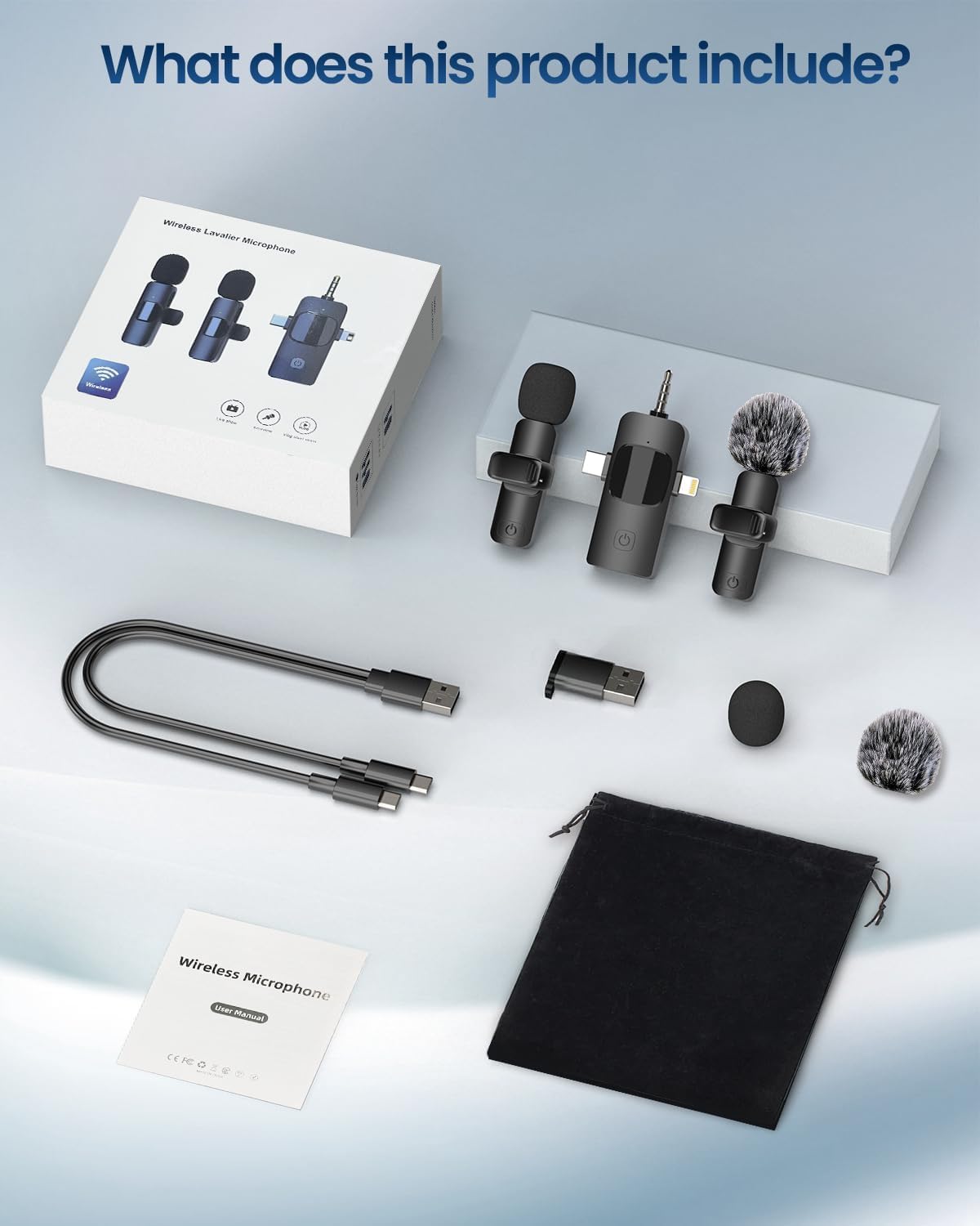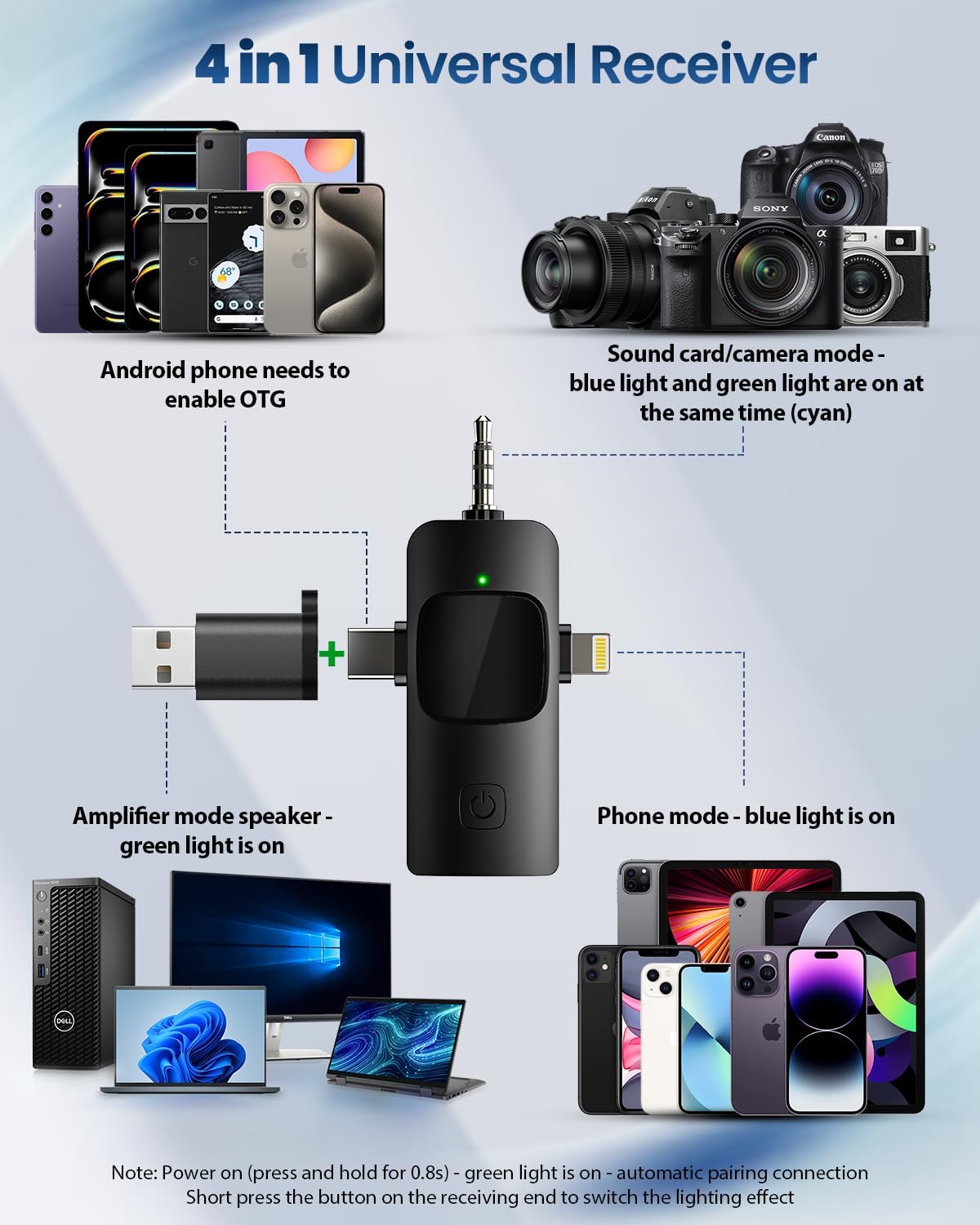 [Compatibility]: The upgraded wireless microphone comes with a 4 in 1 universal receiver, eliminating the need to replace multiple individual interfaces or interface cables. Compatible with android smartphones, iphone(including iPhone 15), iPad, laptops, personal computers, camera etc. Such as Type-C Android phones (some phones require OTG to be enabled) and USB-C port laptops/tablets, but also compatible with iPhone 15 (USB C).