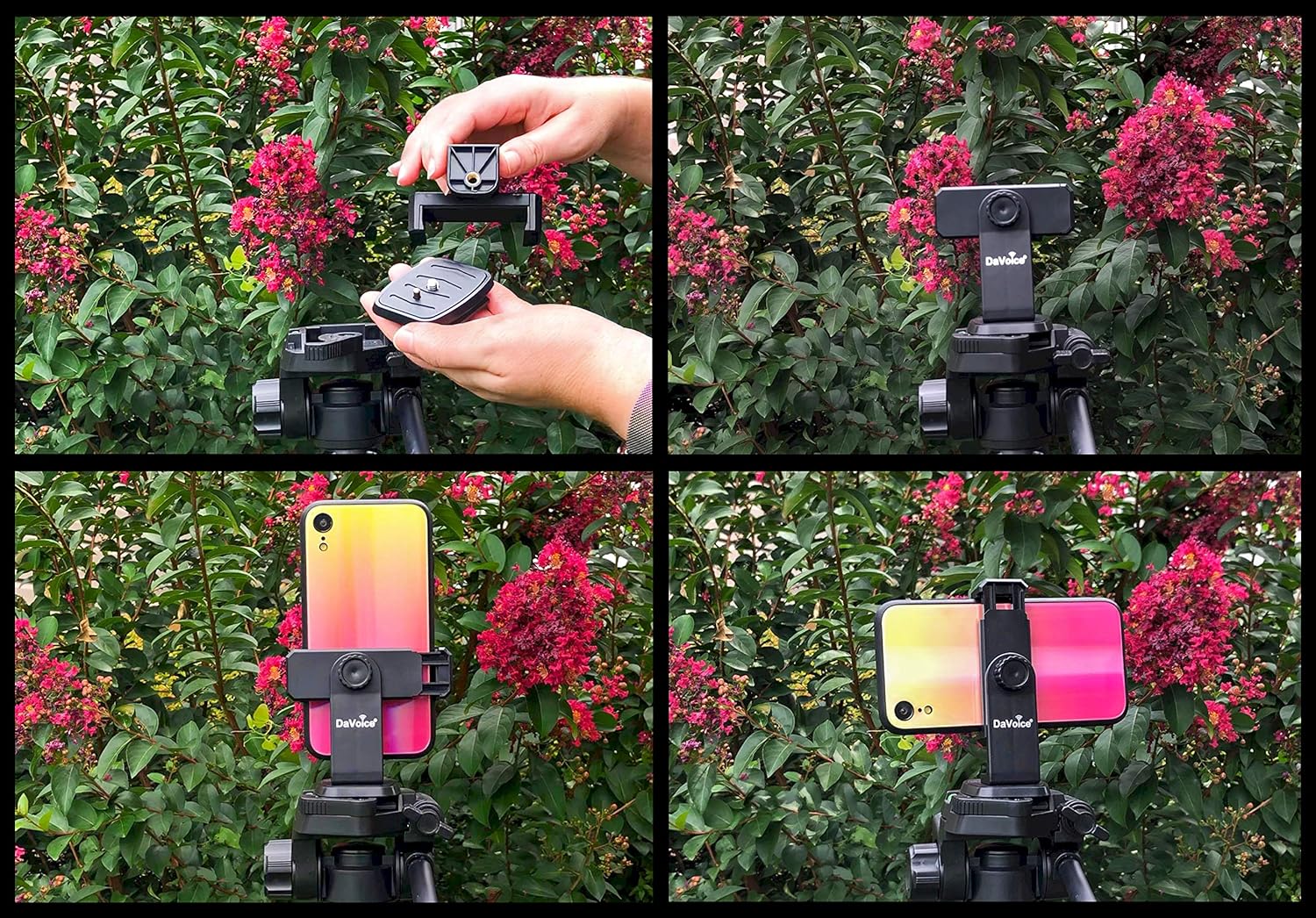 This DaVoice cell phone holder for tripod is the most effective tool for taking Selfies wherever and whenever. Avoid frustration when taking Selfies or videos by using this smartphone tripod mount, as you will now find the perfect angle or position for your phone.