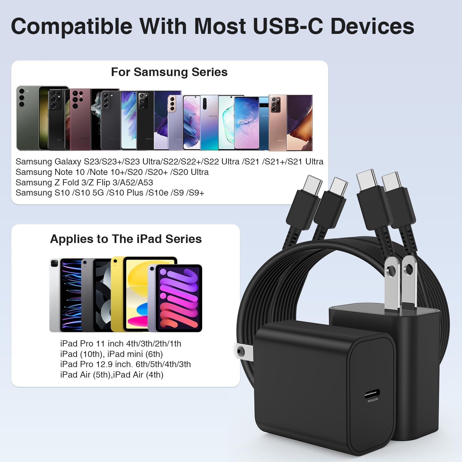 Universal Samsung Phone Charger: The 45w Samsung S23 Ultra/S23 charger supports Power Supply ,ensures flawless compatibility with samsung phones and Laptop.Including Samsung Galaxy S24 Ultra/S24+/S24/S23 Ultra/ S23+/S23/S22 Ultra/ S22+/S22/S21 5G, S21+ 5G, Tab S8,Tab S8+, and S21 Ultra 5G, S20 5G, S20+ 5G, S20 Ultra 5G,Note 20 5G, and Note20 Ultra 5G, Z Flip, Fold2, Z Flip2, Z Fold3, Z Flip3, Galaxy S8 ultra, S8, S8+, S9, S9+, Galaxy Note8, Note9, Note10, Note10 plus, Note10+ 5G, Google Pixel 6.