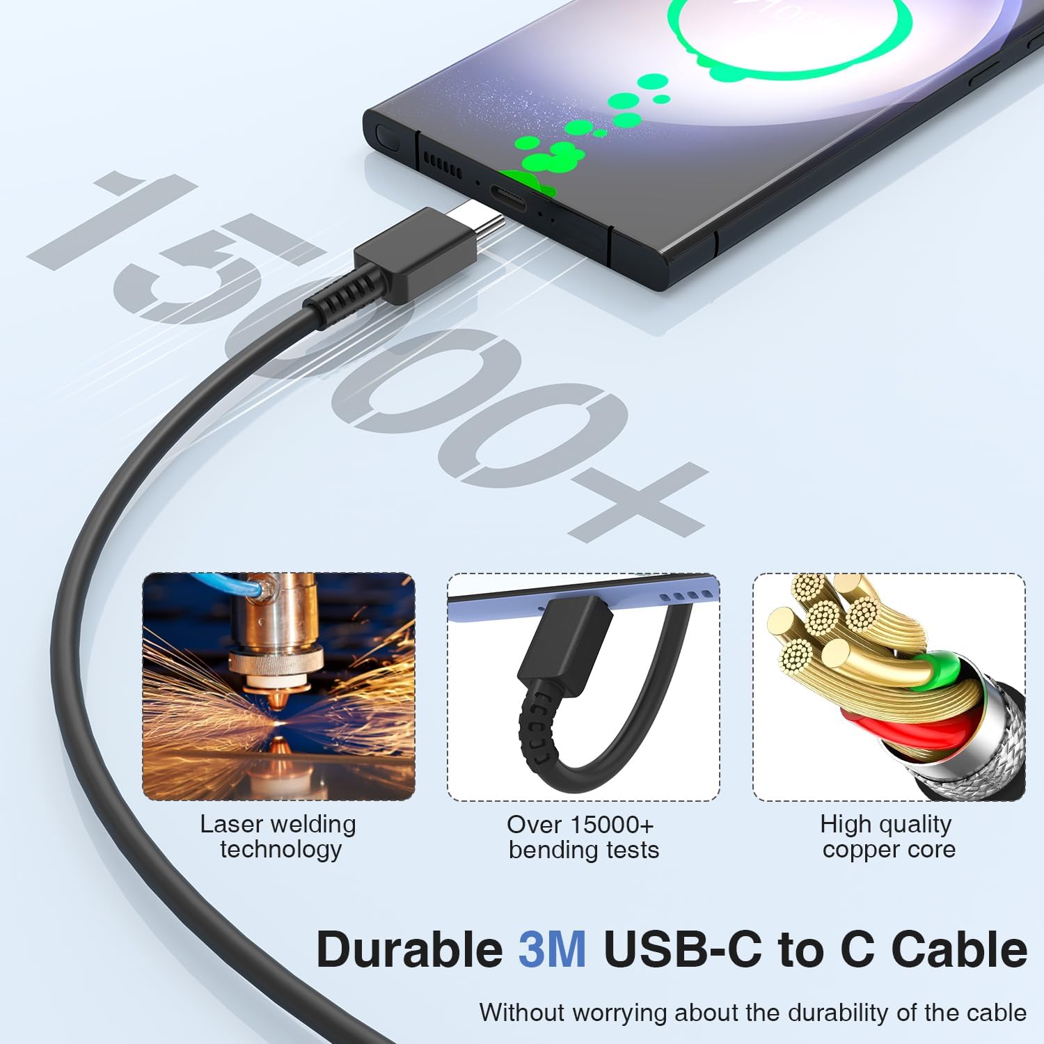 10FT Samsung USB C Charger Cable: The Long 10FT Samsung S23 Ultra/S23 super fast charger type c cable delivers up to 5A to give your phone power at a faster rate than standard 1A or 700mA charger cord. 10ft extra length lets you freely charge your Samsung S23 Ultra/S23 from any occasions like on sofa/bed, or at office. high quality copper core is sturdy to bear 12000+ bending and makes it 5x more durable for longer use.