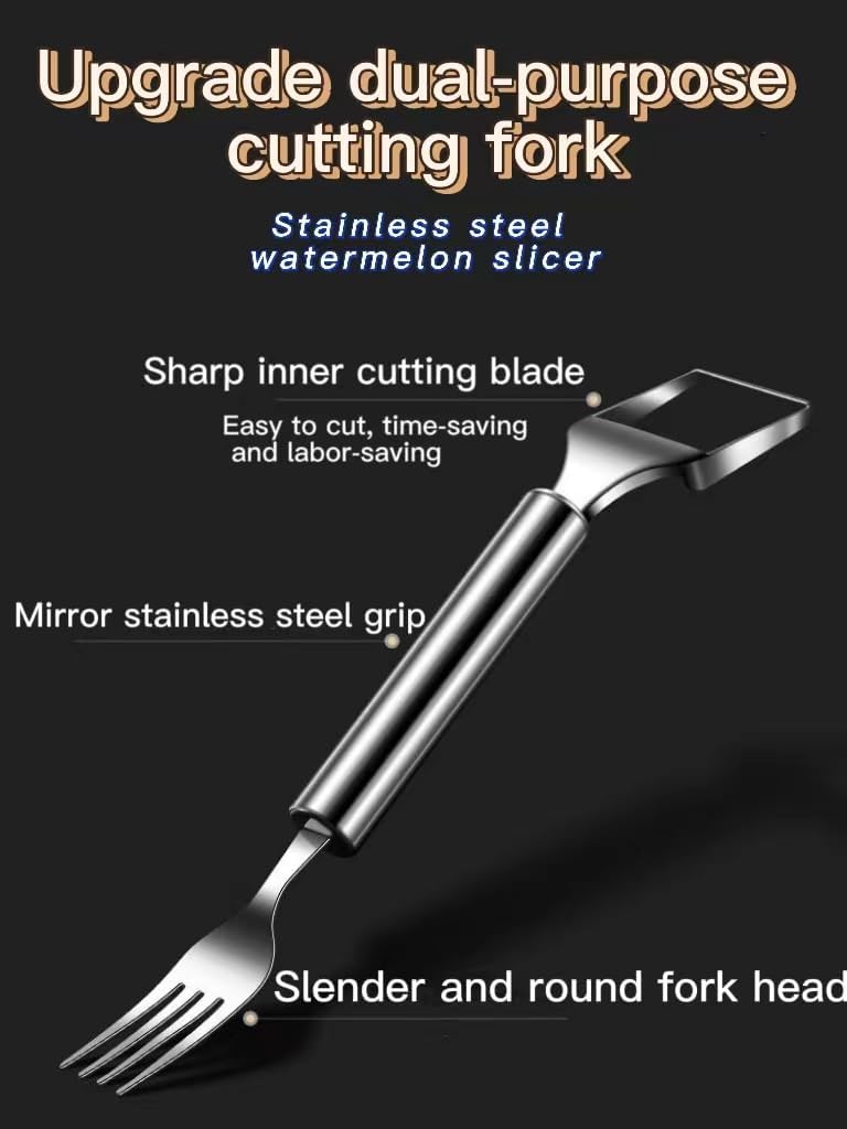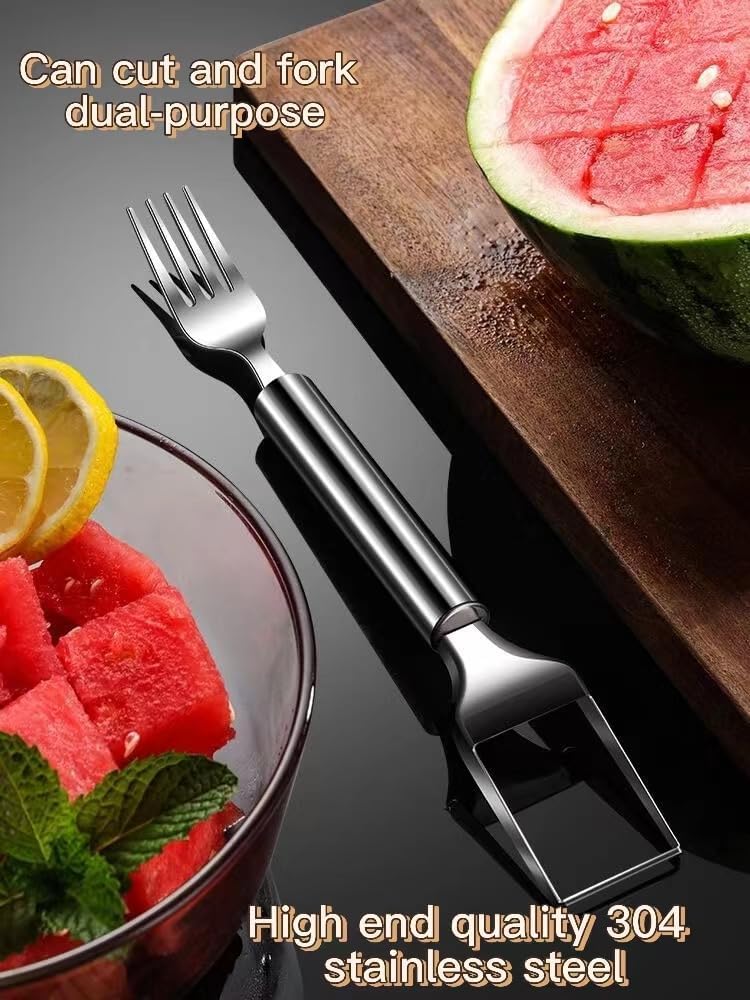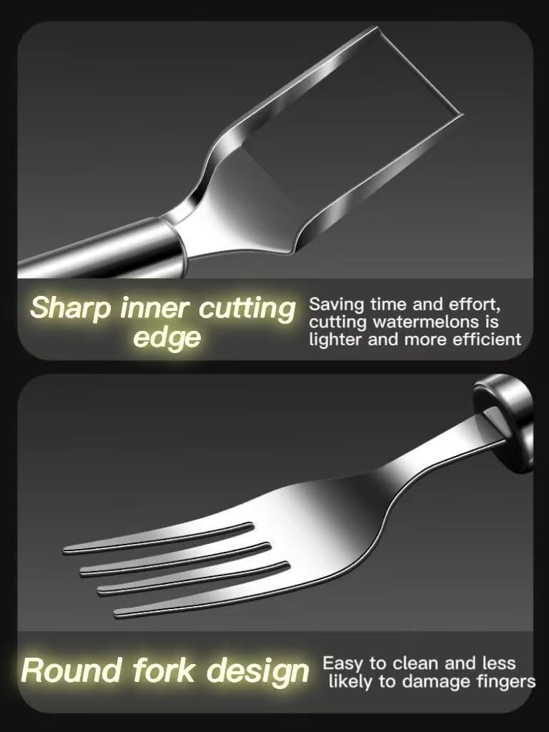 🍉【2-in-1 Stainless Steel Fruit Cutter】This watermelon fork slicer adopts a 2-in-1 design, cleverly combining a fork and slicer into one. Not only can you easily cut watermelon into cubes with it, but you can also enjoy it directly with a fork. This not only makes the slicing process easier, but also allows you to enjoy your watermelon without having to worry about juice splashing around. reinforced and durable. The forks are finely polished, the edges are smooth and burr-free and easy to clean, which can be used for a long time.