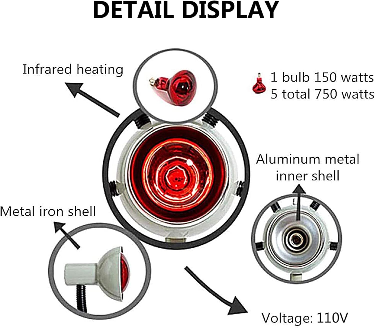 Each lamp has 150 watts and the total wattage is 750 watts. Adjustable time setting.
