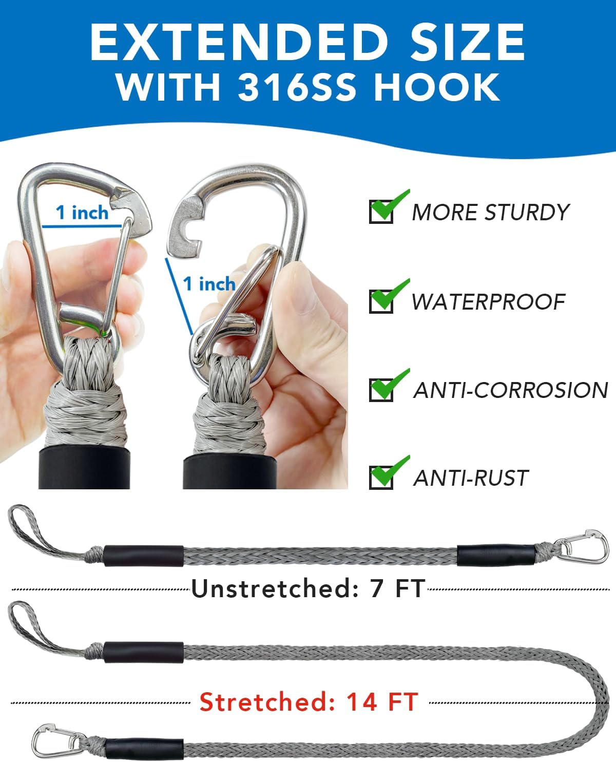 7FT Stretch to 14FT Boat Beach Anchor Rope Bungee lines for Beach Anchor, PWC, Pontoon, Canoe,Jet Ski Or Seadoo, PWC Accessories, Shallow Water Anchor Pole 1-Pack (Grey)