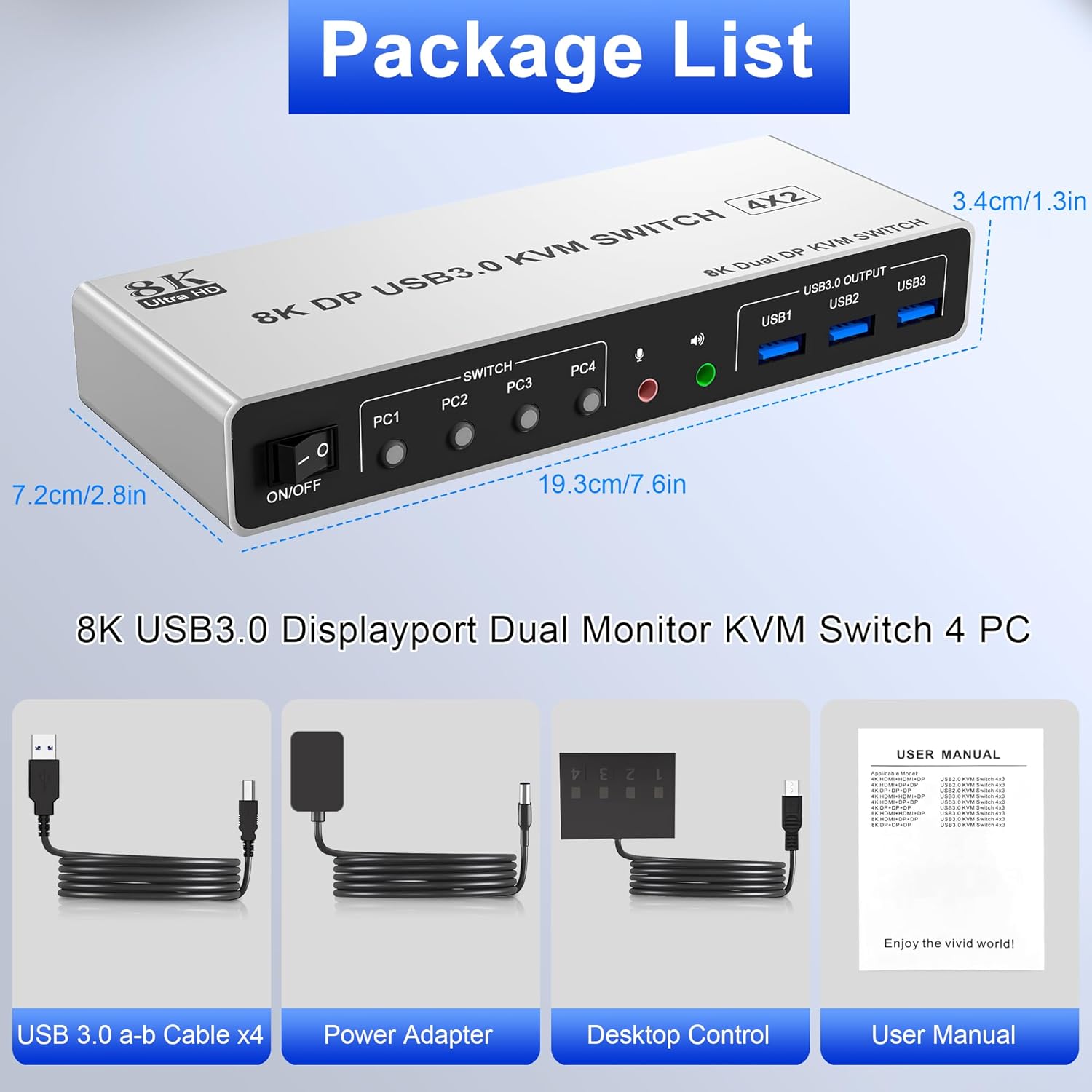 What You Get: 1x 4 Port 8K@60Hz USB 3.0 DisplayPort Dual monitor KVM Switch, 4 x USB 3.0 Cables, 1x Power Adapter, 1x Wired Button Contorller, 1x User’s manual.