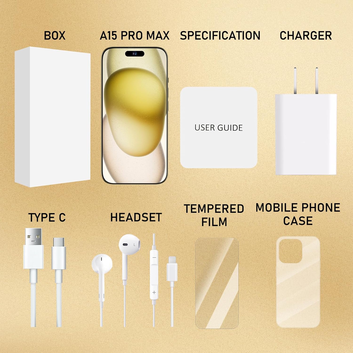 A15 Pro Max Unlocked Phone,8GB+512GB Ultra Memory Android Phone,6800 mAh Battey,6.82-inch HD Screen,Dual SIM, Dual Standby,108MP Camera Cell Phone, 5G Phone.(Gold)