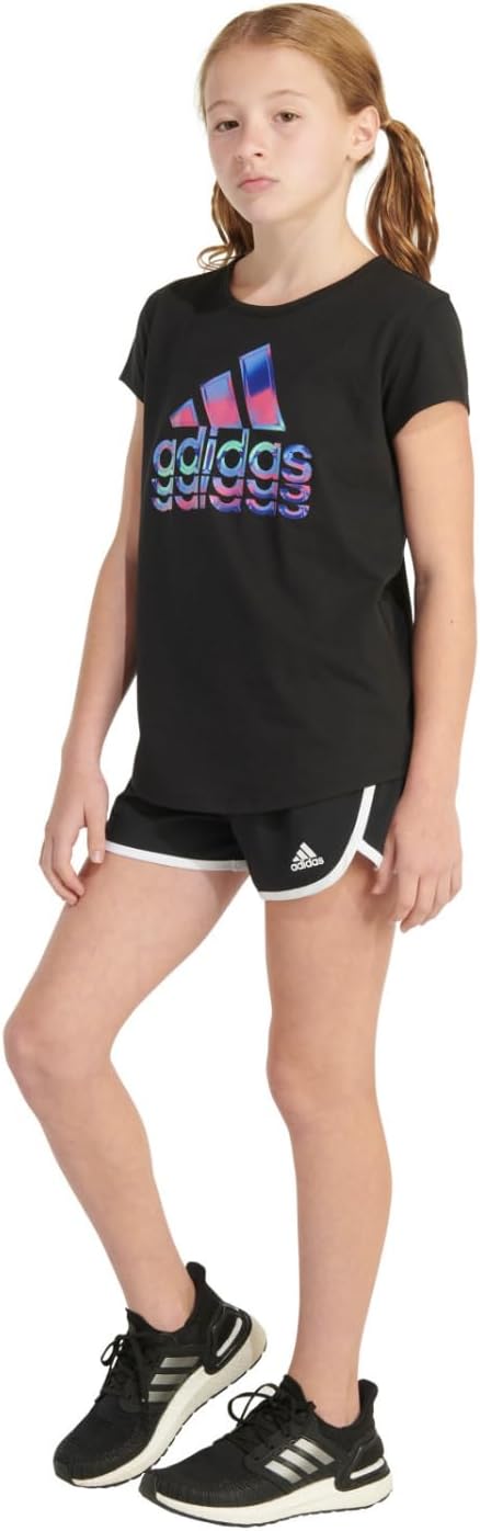 Add a touch of color to her daily wardrobe. Rainbow metallic ink fills in the adidas Badge of Sport on the front of this girls’ t-shirt. Cotton-blend jersey is comfortable and durable. A curved hem is longer in back for full coverage.