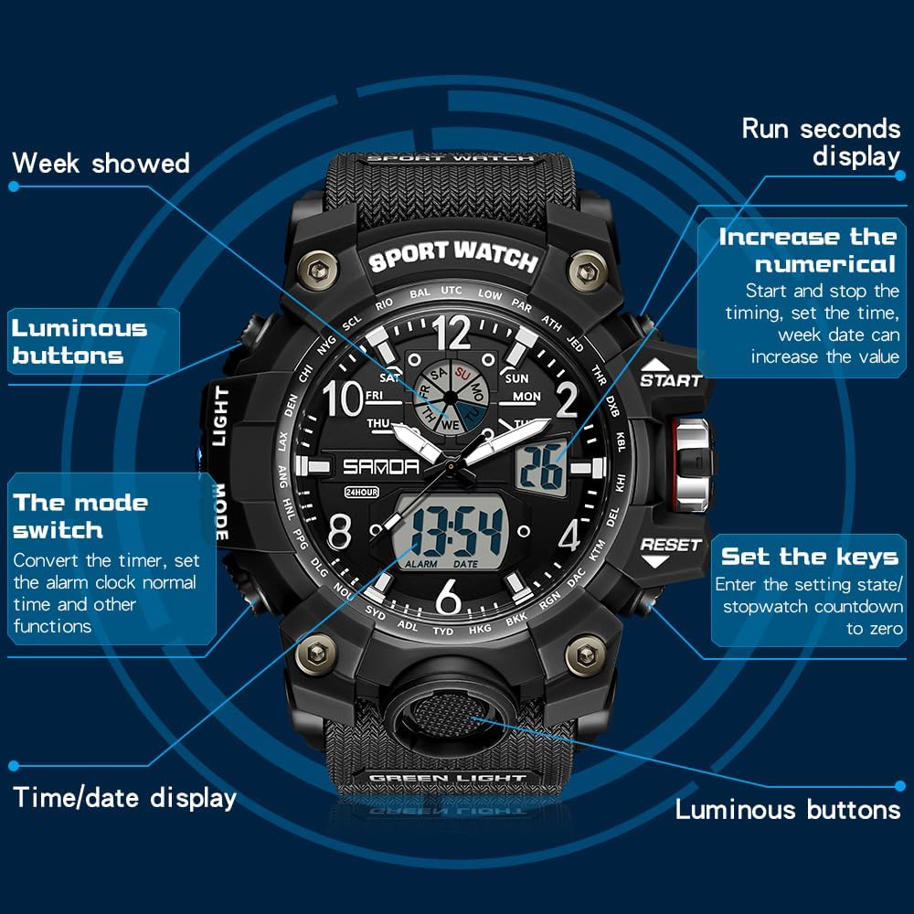 Multiple functions and comfortable band are suitable for sportsDual-display sporty big face fashionable design fits daily matchMovement:Japan import quartz movement and electronic movement.Stopwatch/Calendar/Alarm/Date Calendar- Date/Week display/12/24-Hour time format/LED backlightShockproof, suitable for both outdoor and indoor activities & sports, such as running, climbing, business work ect.lassic Casual Sport Watch Design.LED Back Light