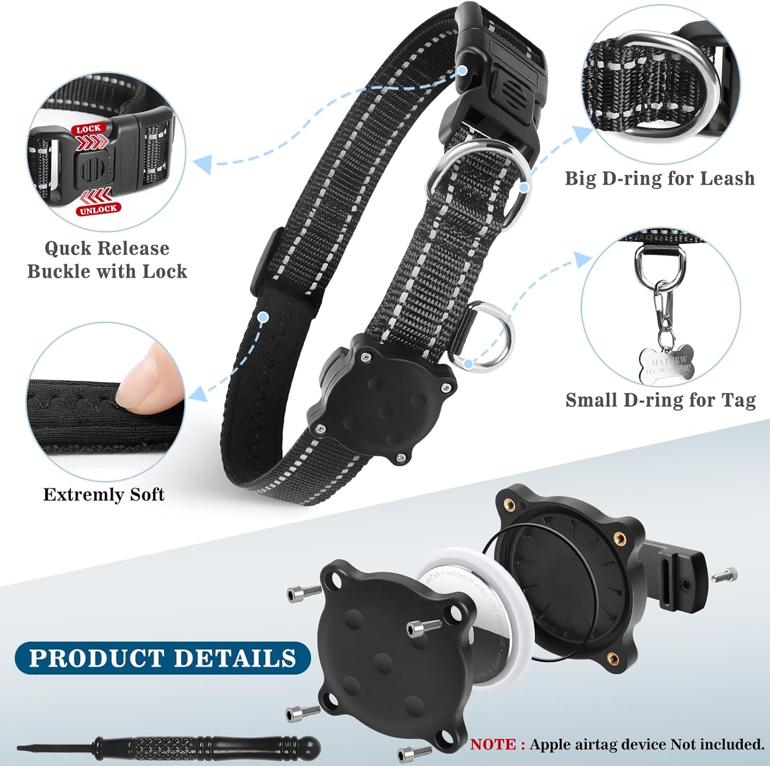 Durable & Convenient:This air tag dog collar has a quick release buckle with a lock button witch is durable and easy to use,also can keep staying with your fur friend.The air tag holder is also easy to put on or remove the airtag device,because there is a screwdriver to help you deal with that .