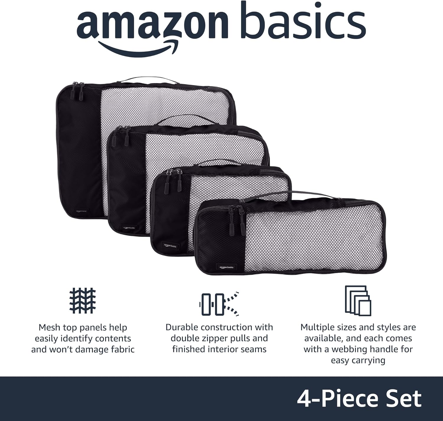 Be the first to review “Amazon Basics 4 Piece Packing Travel Organizer Zipper Cubes Set, Small, Medium, Large, and Slim, Black”