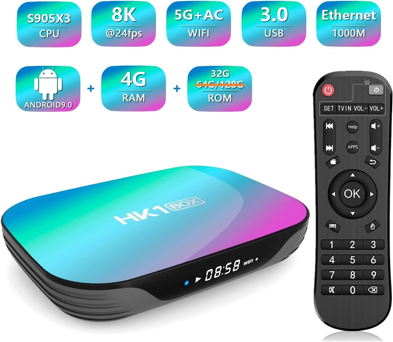 Android 9.0 Smart TV Box with Upgrade Amlogic S905X3 Quad Core 64bit Cortex-A55, G31 MP2, 4GB RAM 32GB ROM, Dual WiFi 2.4G/5G &BT4.0, LAN 1000 RJ-45, H.265/HD 8K with Learning Remote Control